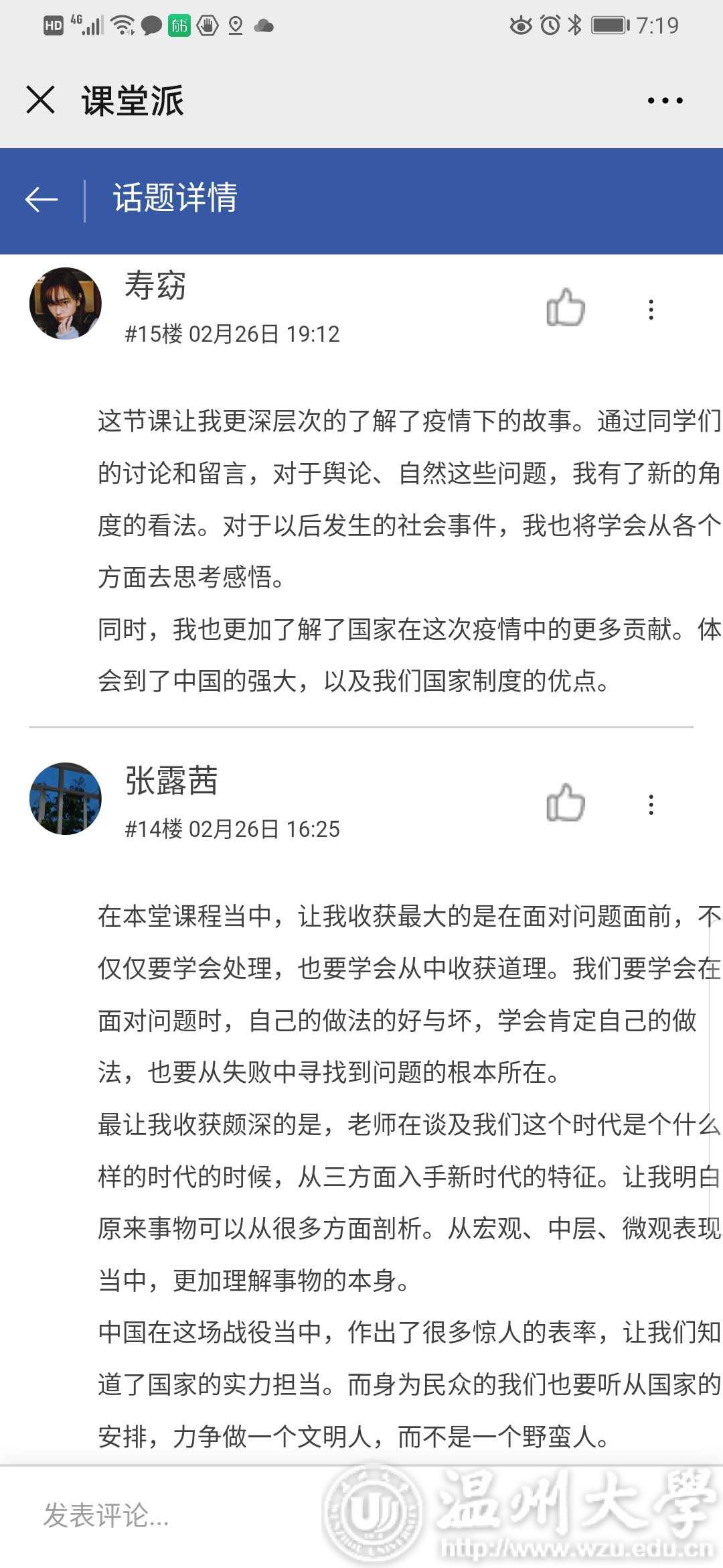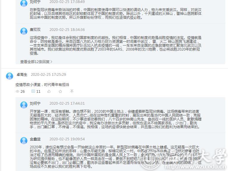 在《概论》课教学平台讨论区,同学们积极留言“抗疫思政第一课”的感想,表达了战胜疫情的必胜信念和中国制度的力量与优越性。刘何宁同学留言说:“开学第一课,我深有感触。谁也想不到,2020的中国土地上,会肆虐着新型冠状病毒。这场病毒带来的迫害无疑是巨大的,经济损失、人员伤亡...... 八十四岁的钟南山先生、奋战在一线的医护人员、默默捐赠物资的平凡天使...... ”。