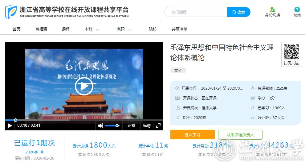 学院在巩固提升“一化六制”思政课综合改革的基础上,近年来高度重视提升思政课教师信息化能力素养。在抗“疫”期间,推进2门省级精品在线开放建设课程《毛泽东思想和中国特色社会主义理论体系概论》(以下简称《概论》)和《工程伦理与社会》在浙江省高校在线开放课程共享平台运行,另外《马克思主义基本原理》和《概论》课在智慧树在线教育平台使用。为响应教育部有关文件精神,学院将三门思政理论课程免费共享,截止2月26日,《概论》课第一期慕课省平台已有11所高校师生超过9.4万人次的访问量。