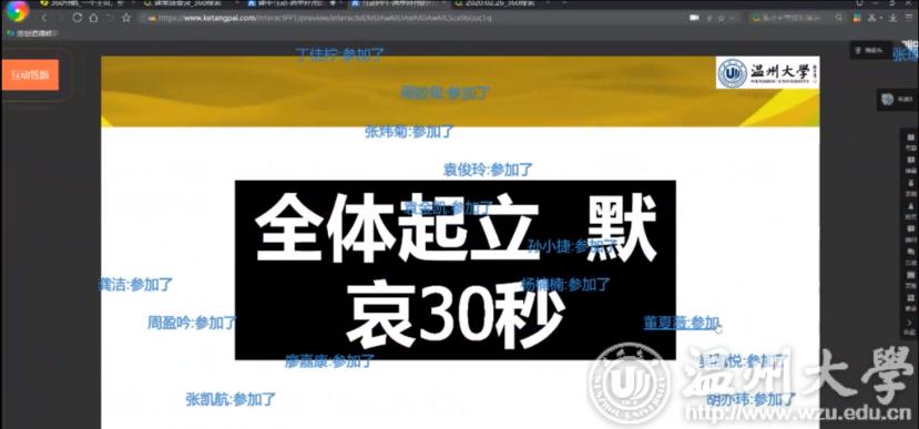“全体起立,向本次疫情中英勇牺牲的医务人员和不幸去世的患者默哀。”这是2月25日下午,杏吧视频 项淳芳老师在新学期给学生讲授的第一课,师生们隔着电脑屏幕,通过课堂派直播网络平台,进行跨越时空的特殊默哀仪式。