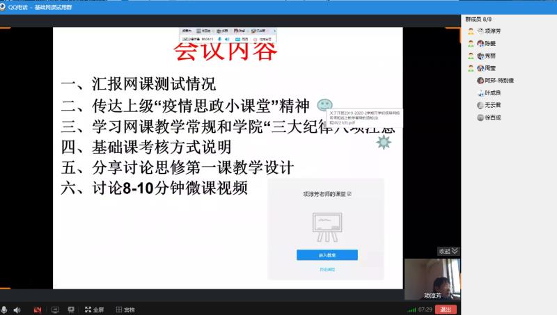 本次网络集体备课会共有五项议程。第一项议程是每位老师汇报网课测试的情况,就课堂派和QQ群、腾讯课堂等网络平台存在的问题、学生的到课情况、网络上课遇到的问题和解决办法,各位老师做了深入的交流。第二项议程是由项老师传达上级“疫情思政小课堂”精神、学习网课教学常规和学院“三大纪律八项注意”,与会教师进行了认真的学习。第三项议程是基础课考核方式说明,由于疫情的原因,目前采用网络授课的方式,所以在考核分数上进行了相应的调整。第四项议程是各位老师分享讨论思修第一课教学设计,各位老师结合自己收集整理的相关素材,思考交流了如何将战“疫”中体现的中国精神、集体主义、社会主义核心价值观等融入思政课教学中,通过课前预习资料与话题讨论、课中互动、课后反思、测试与实践等环节,确保线上教学质量。在会议的最后,针对8-10分钟微课视频的制作,每位老师发表了自己的看法,比如可以采用朗诵作品、致信学生、感人故事、经典案例分析、分享心路历程、主题直播等形式录制微课。