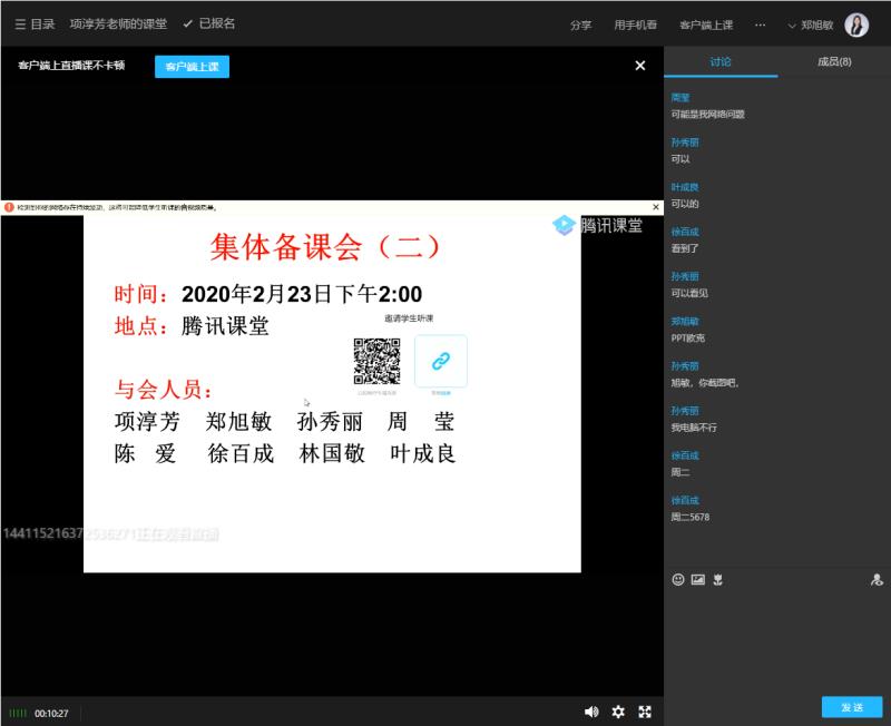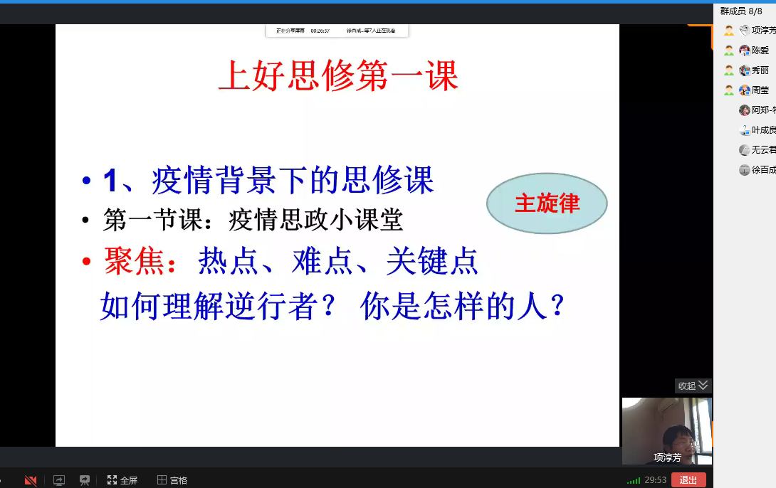 两个半小时的网络集体备课,各位老师仍意犹未尽,大家在群里继续分享了丰富的教学资源。本次专题网络集体备课是基础教研室在备课组织形式上的一次创新,也是当前特殊环境下,思政课教师以自己的方式关注疫情、支持抗“疫”、主动作为的一种表达。本次备课会为接下来基础课网络授课的顺利开展奠定了基础。