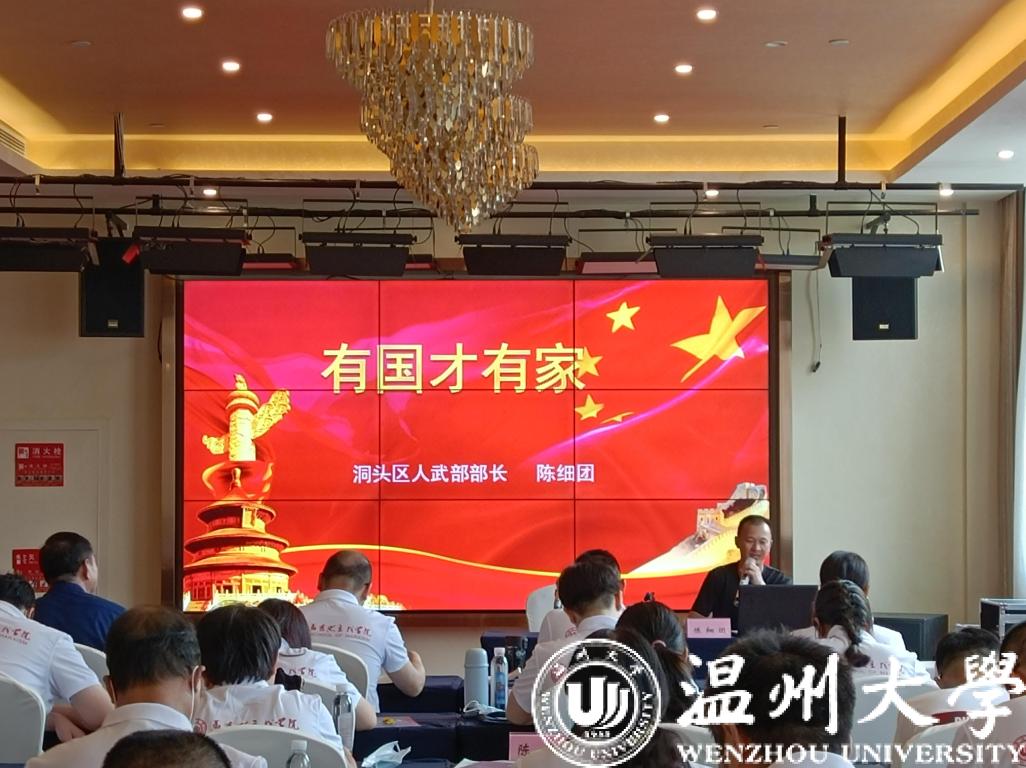 开班仪式结束后,洞头区人武部部长陈细团以“有国才有家”为题作了国防安全教育专题报告。