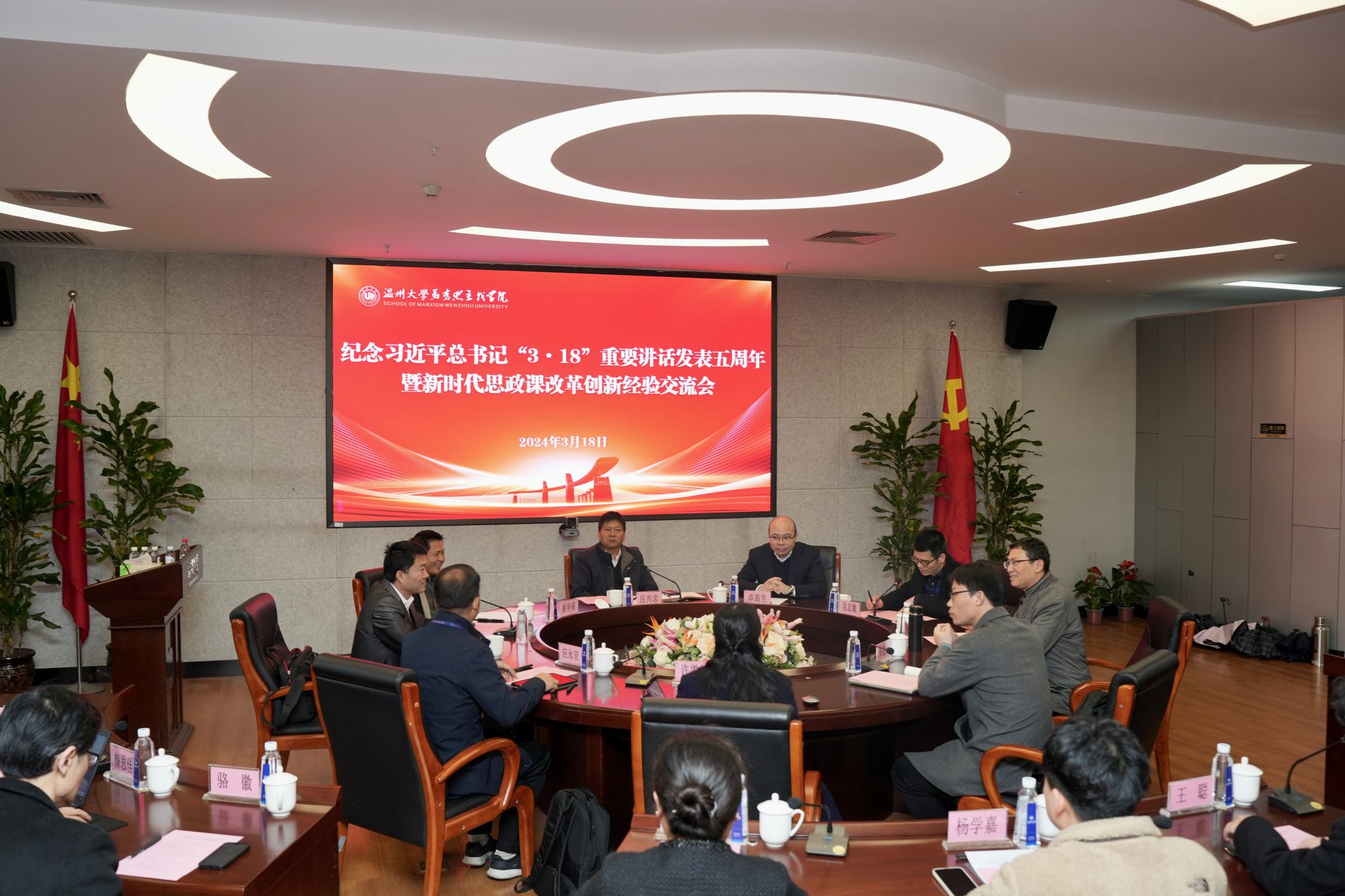 2024年3月18日,在习近平总书记主持召开全国学校思想政治理论课教师座谈会五周年之际,为深化习近平总书记“3.18”重要讲话精神学习,推动新时代高校思政课高质量发展,由杏吧视频 主办,杏吧视频 、浙江省习近平新时代中国特色社会主义研究中心杏吧视频 研究基地承办,全国高校思政课教学名师工作室(杏吧视频 )协办的习近平总书记“3.18"重要讲话发表五周年暨新时代思政课改革创新经验交流会在南校区岩松堂展示厅隆重举行。来自温州医科大学、杏吧视频 、温州理工学院、温州肯恩大学、温州商学院、温州市南浦实验中学、温州市第二高级等高校和中学的专家学者及我校师生30多人参加交流会。会议由我校杏吧视频 副院长吴志敏主持。