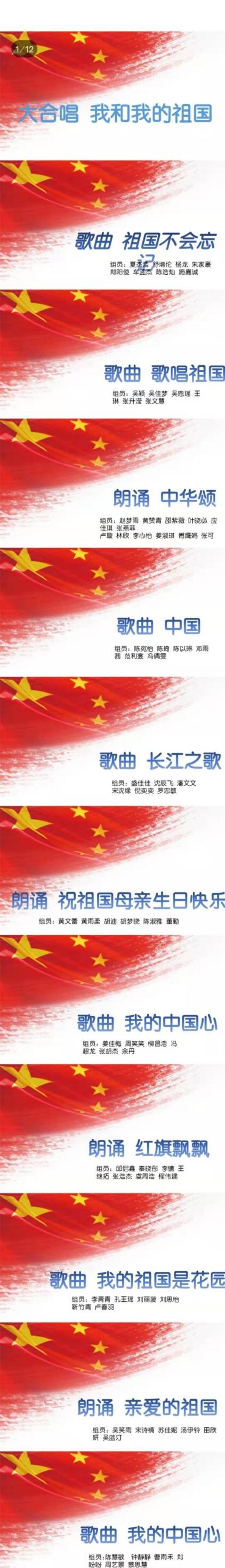 从下午1:30师生共唱《我和我的祖国》到压轴节目《追梦赤子心》,同学们以小组合唱和朗诵的形式共演绎了《祖国不会忘记》、《歌唱祖国》、《中华颂》、《中国》、《长江之歌》、《我的中国心》、《红旗飘飘》、《祝祖国母亲生日快乐》等10个节目。学生们自编自导自己主持,台上纵声歌唱激情朗诵,台下挥舞小旗,一次次掌声响起,一声声祖国你好让人心潮澎湃。虽然由于准备时间很短整个表演难免不够娴熟不够精湛,但他们情真意切,充分展现了青春活力和才情,表达了对祖国的自豪和热爱。