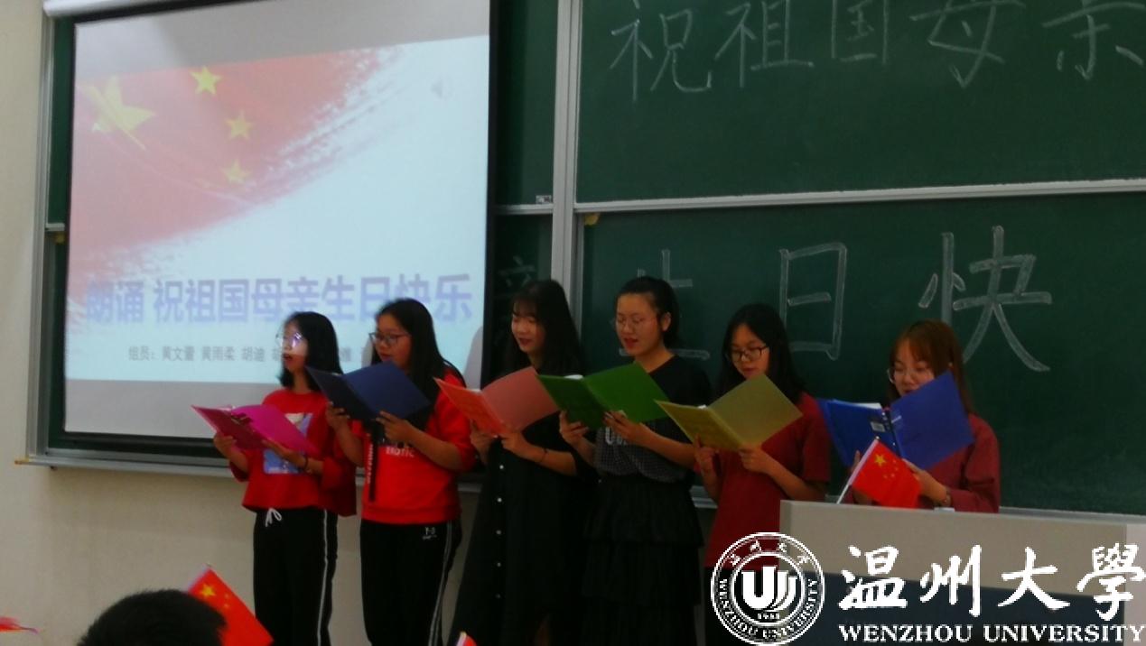 歌唱祖国,赞美祖国不一定要豪华的舞台,炫目的舞美和音响,也不一定要华美的服装。这不,在杏吧视频 南校区3B301和3B101教室里,在《毛泽东思想和中国特色社会主义理论概论》的课堂上,在简陋的七尺讲台,18级数学和统计专业的全体同学,以小组为单元,全员参与,唱出了对祖国的赞美和祝愿。