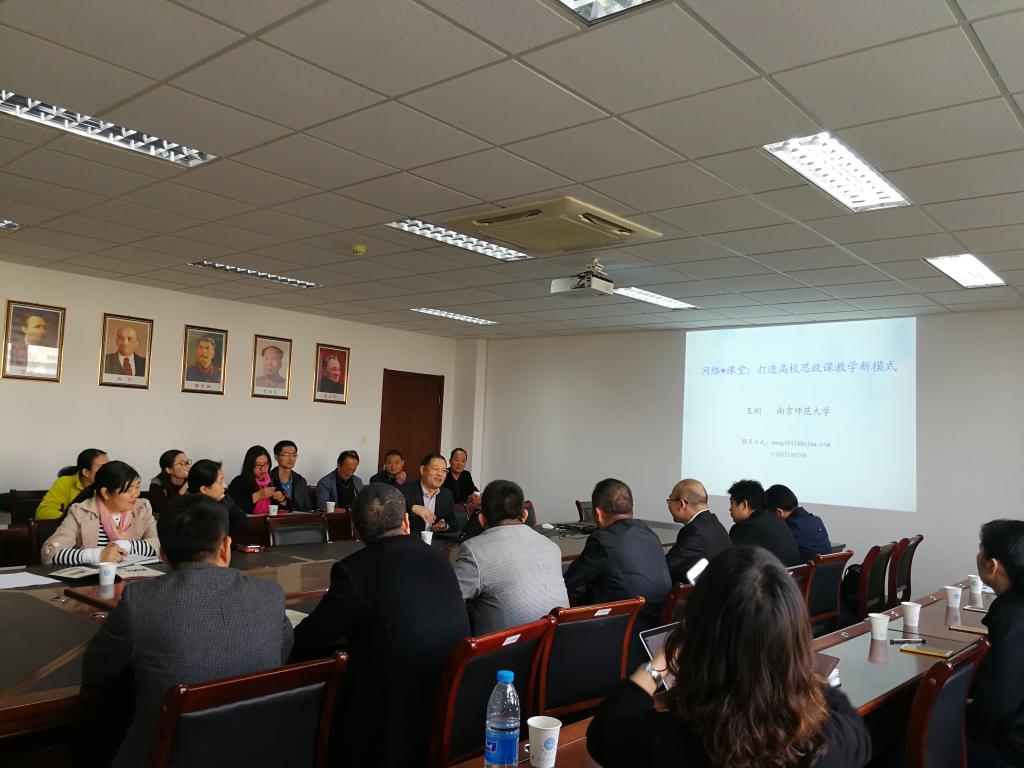 王刚院长首先热情欢迎温大马院一行,并介绍学院的总体情况。王院长以“网络+课堂:打造高校思政课教学新模式”为题全面介绍了思政课的 “网络化学习机制”、“认知性课堂讲授”、“互动式学习体验”、“过程化教学评价”和“科学化教学管理”“五位一体”教学模式。他们运用“毕博”网络平台,给学生提供自学课件和能够帮助学生拓展视野、深入理解教材知识的教学案例、阅读材料等,构建学生网络教学模块。学生在完成教材和网上知识性自学任务后,必须在规定时间内做完包括客观题和主观题的单元测试。在学生通过网络平台完成基本知识层面的自我学习后,教师课堂教学的主要任务是充分发挥主导作用,建构学生的认知体系。教学过程就由教材内容的讲解转变为教学重点、难点的深度解析,进行课堂引导和互动。同时,南师大杏吧视频 还构建了网络互动教学模块,在网络平台上设计出让学生有较大发挥空间的问题,引导学生开展讨论发言,教师和其他同学进行网上回复和评论,通过网上讨论和课堂互动,建立起教师与学生、学生与学生、网络与课堂之间的互动教学体系。