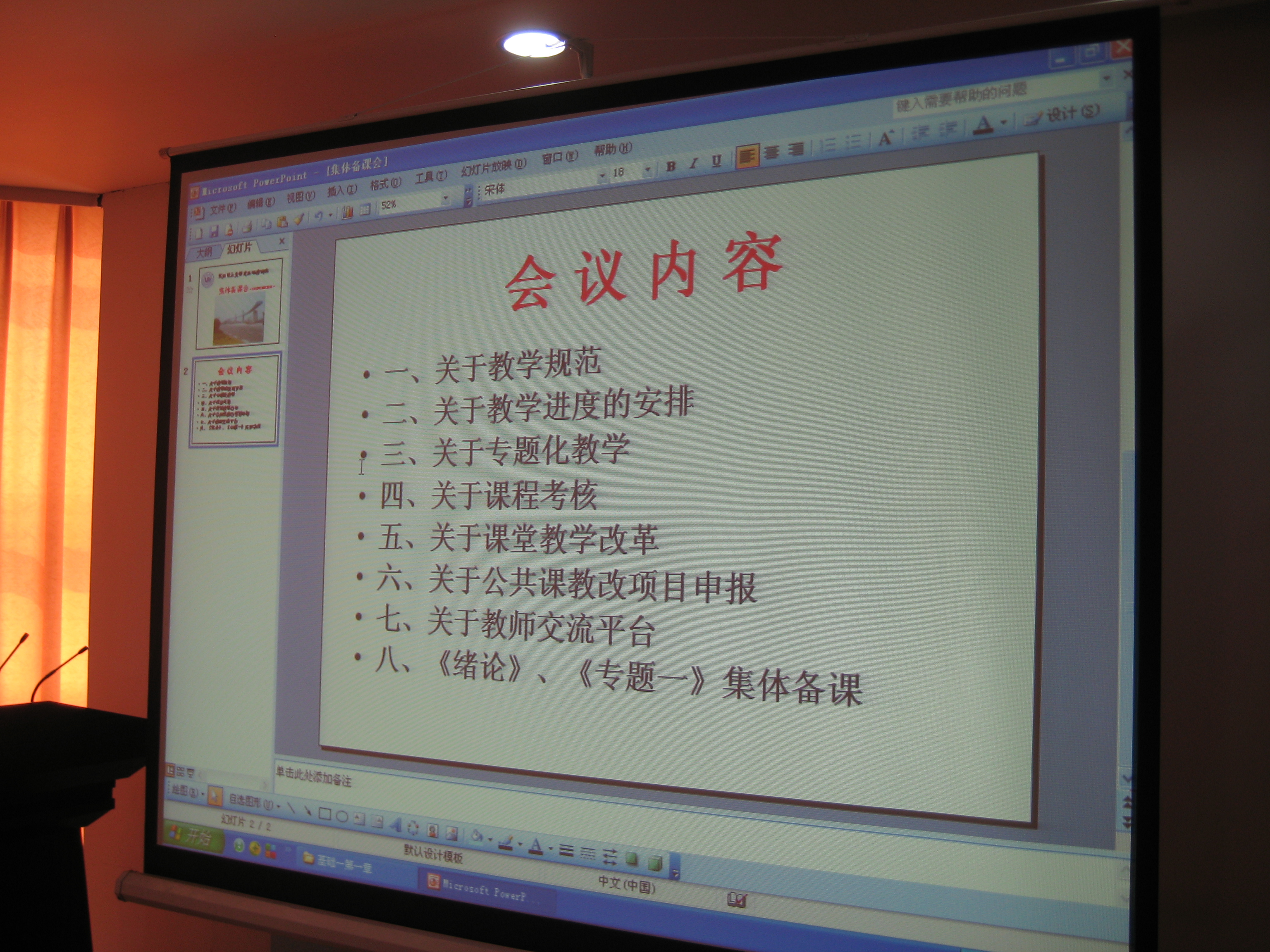 备课会最后,郑旭敏老师与大家分享了自己关于《绪论》和《专题一》的多媒体课件及其备课思路,并进行了深入的交流和切磋。老师们纷纷表示,今后要继续坚持集体备课制度,利用网上网下平台,定期开展各种形式的备课活动,共同推进教学改革,使更多的大学生真正受益。