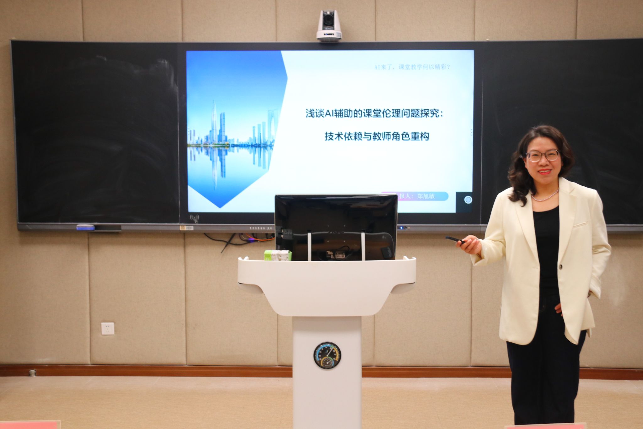 金可仲副教授针对“文盲程序员”现象,警示AI可能带来的教学异化风险,引发对教育本质的深度思考。范宁副教授以Bilibili平台为例,分析了“师一生-智能体”新型教学关系的构建;技术应用方面,孙秀丽副教授现场演示了AI制作专业PPT的技巧,魏春艳副教授分享了AI视频制作提升教学效果的经验,陈爱副教授系统介绍了AI工具在教学全流程中的应用实践。郑旭敏老师从伦理角度切入,探讨了AI时代师生角色重构的挑战与应对。