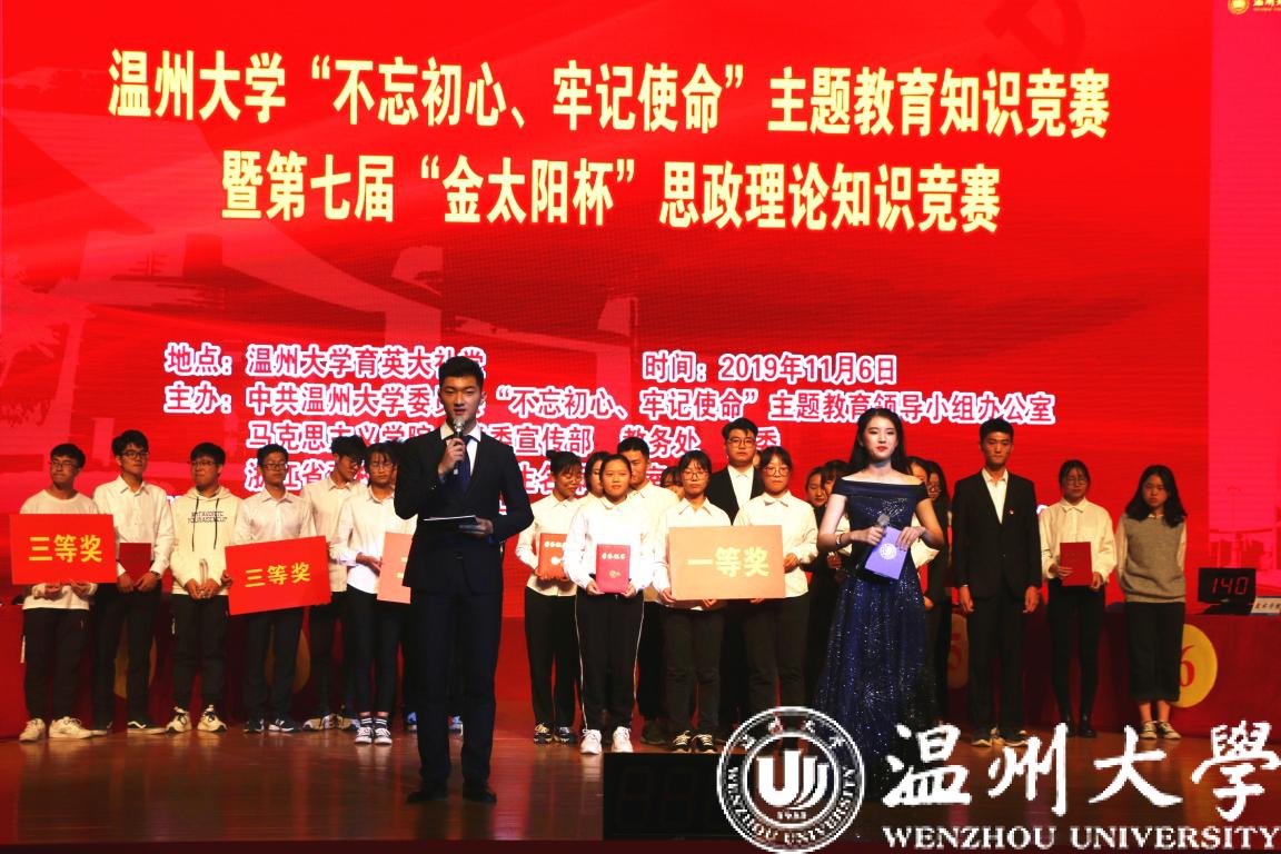 11月6日下午,由杏吧视频 “不忘初心、牢记使命”主题教育领导小组办公室、杏吧视频 、校党委宣传部、教务处、校团委和浙江省高校思政课卓高生名师工作室联合主办,杏吧视频 研究生会及习近平新时代中国特色社会主义思想读书会协办的杏吧视频 “不忘初心、牢记使命”主题教育知识竞赛暨第七届“金太阳杯”思想政治理论知识竞赛决赛在大学生活动中心育英大礼堂隆重举行。