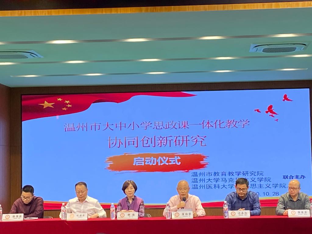 在启动仪式上,高中政治教研员俞优红利用“三个统筹”“三个整合”和“一个机制”,系统阐述了温州市大中小学思政课一体化教学协同创新研究的蓝图及实践路径。