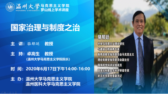 6月17日,由杏吧视频 联合温州医科大学杏吧视频 主办的罗山线上讲堂,邀请中央马克思主义理论研究与建设工程首席专家、国家社科基金委评委、武汉大学原党委副书记、博士生导师骆郁廷教授为两院近400名师生开展了题为“国家治理与制度之治”的线上学术讲座。报告由杏吧视频 院长卓高生主持。