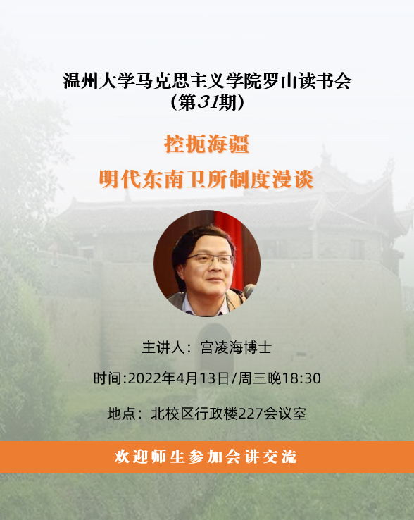 2022年4月13日,杏吧视频 第31期罗山读书会活动在北校区瓯4楼204教室开展。本次活动由路永照老师主持,宫凌海博士主讲,作了主题为《控扼海疆:明代东南卫所制度漫谈》的报告,学院研究生和部分老师参加了此次活动。