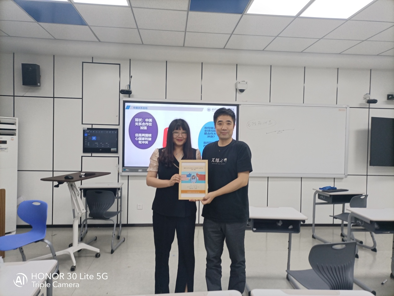 互动环节,陈欢欢博士与现场师生就建构主义中“康德文化状态”和人类命运共同体的关系、弱国和大国博弈时建构主义的应用、大国与大国博弈时建构主义的作用、美国国内总统大选后的政策变更、中美两国之间关系建构的阻碍和未来、等问题进行了充分交流,学术氛围浓厚。最后,路永照老师向陈欢欢博士赠送读书会收藏纪念版海报,活动圆满结束。(通讯员:张良旭)