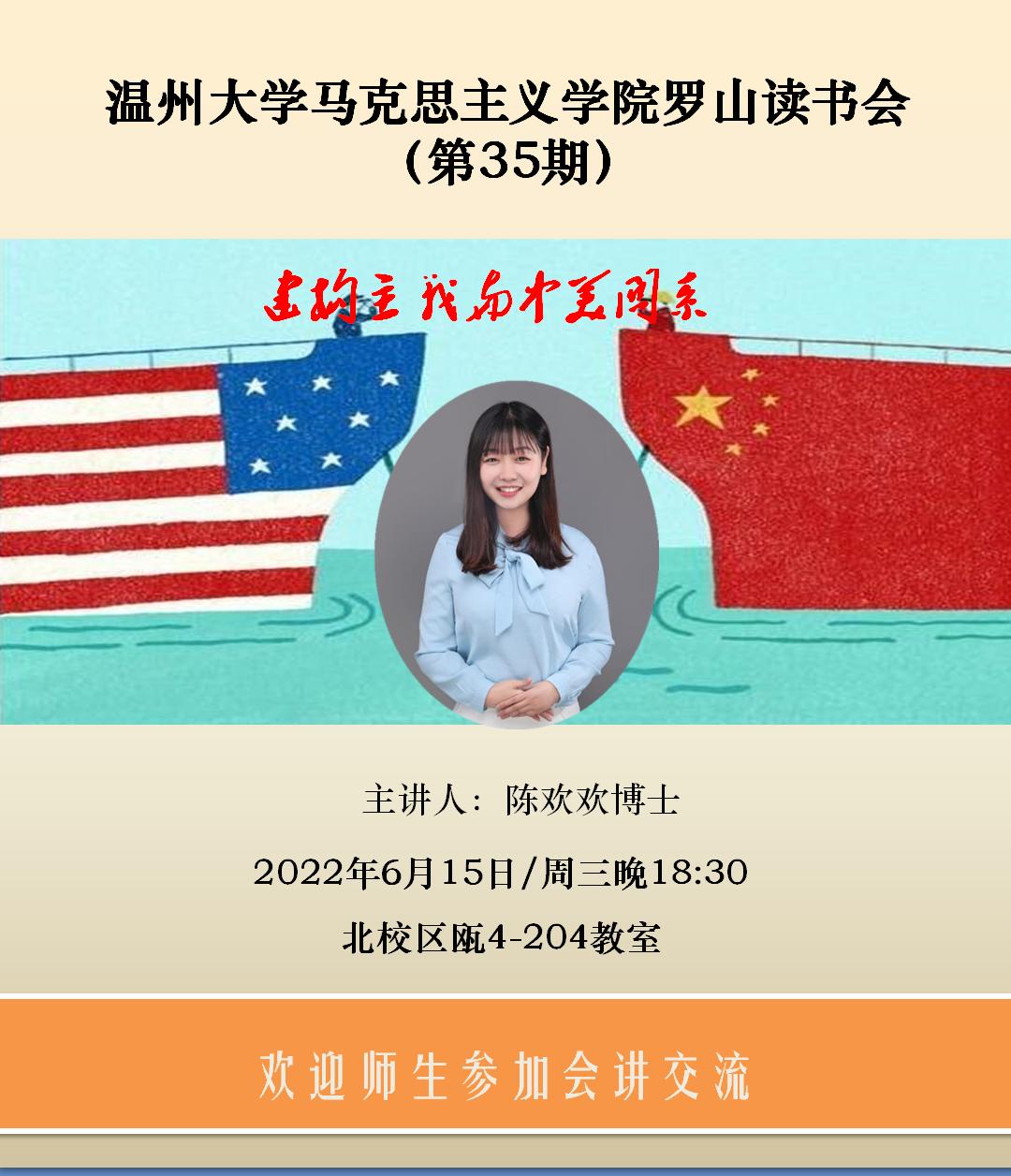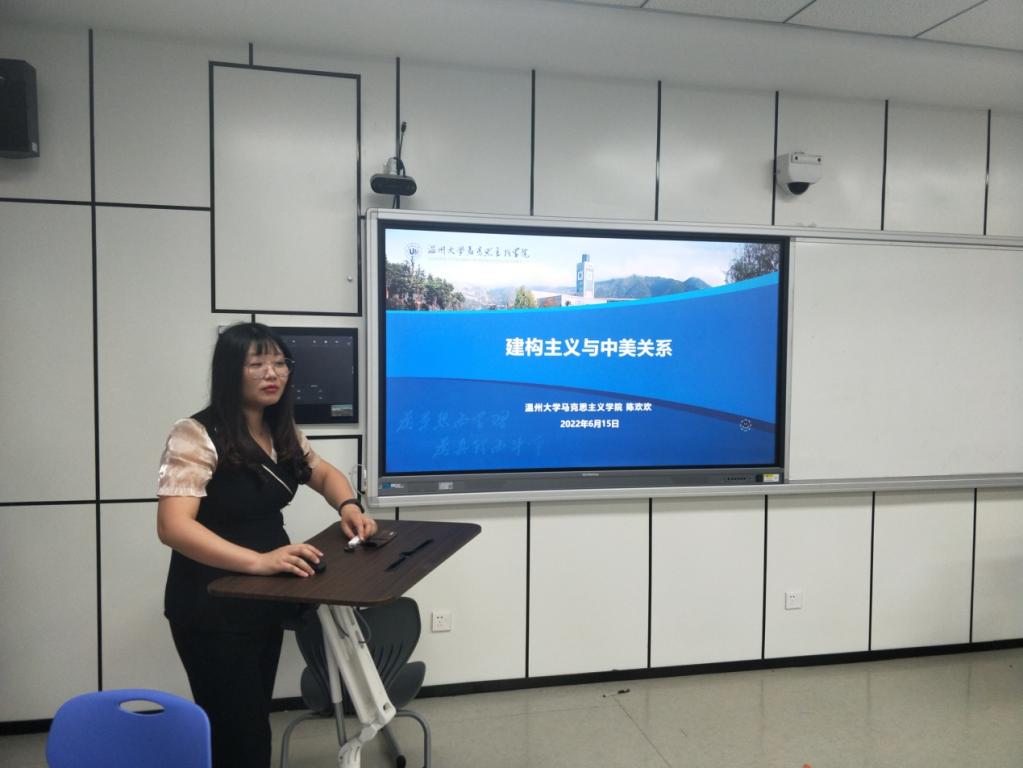 2022年6月15日,杏吧视频 第35期罗山读书会活动在北校区瓯4楼204教室开展。本次活动由路永照老师主持,陈欢欢博士主讲,作了主题为《建构主义和中美关系》的报告,学院研究生和部分老师参加了此次活动。