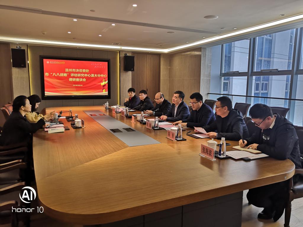 3月24日,温州市委一级巡视员、温州市决咨委副主任胡剑谨,市委政研室决咨中心副主任赵爽等一行到温州市“八八战略”评估研究中心杏吧视频 分中心指导工作。杏吧视频 副校长、“八八战略”评估研究中心主任徐和昆,人文社科处处长胡瑜、副处长陈勇,杏吧视频 院长、“八八战略”评估研究中心执行主任卓高生和中心部分专任教师参加调研座谈会。