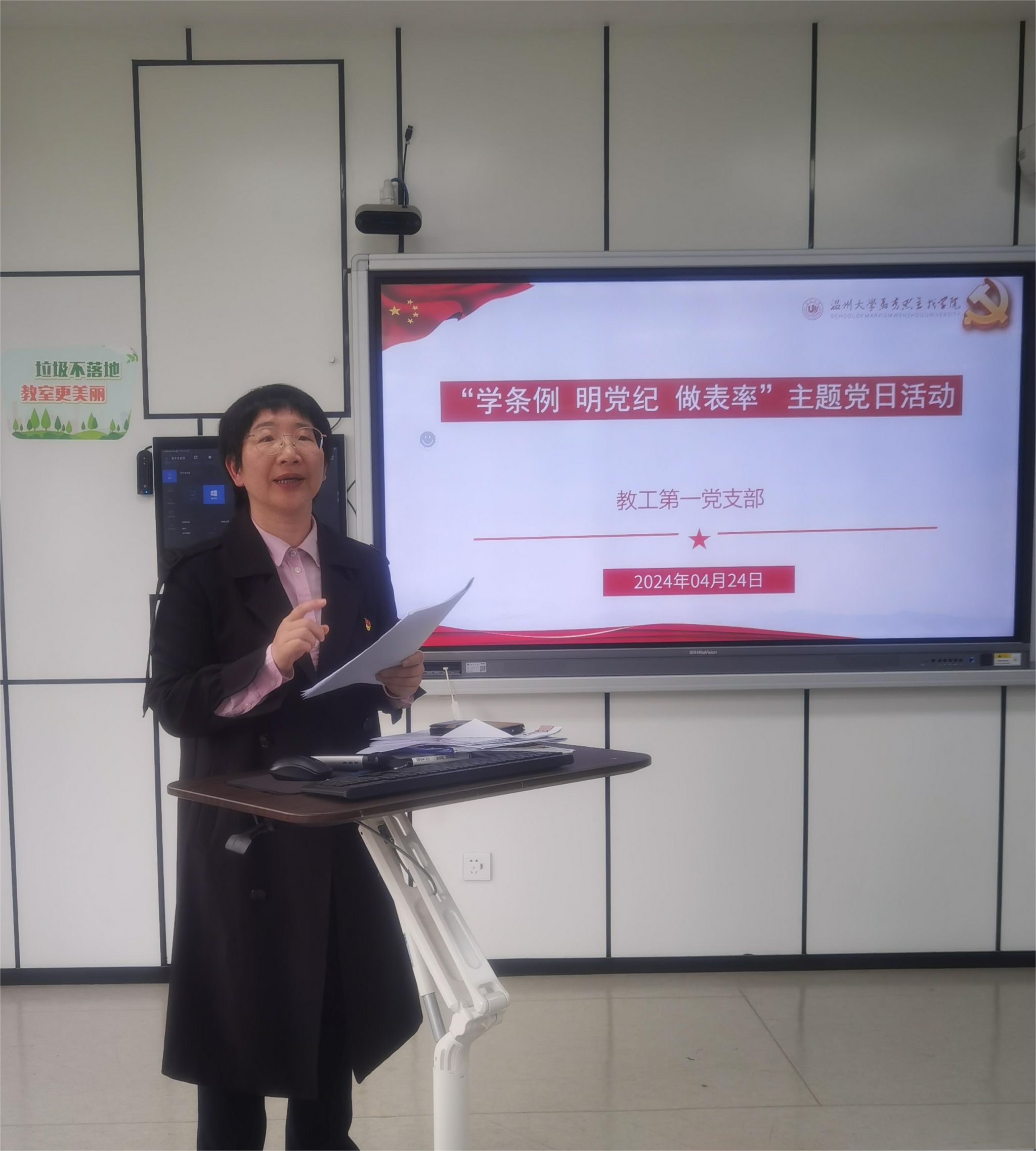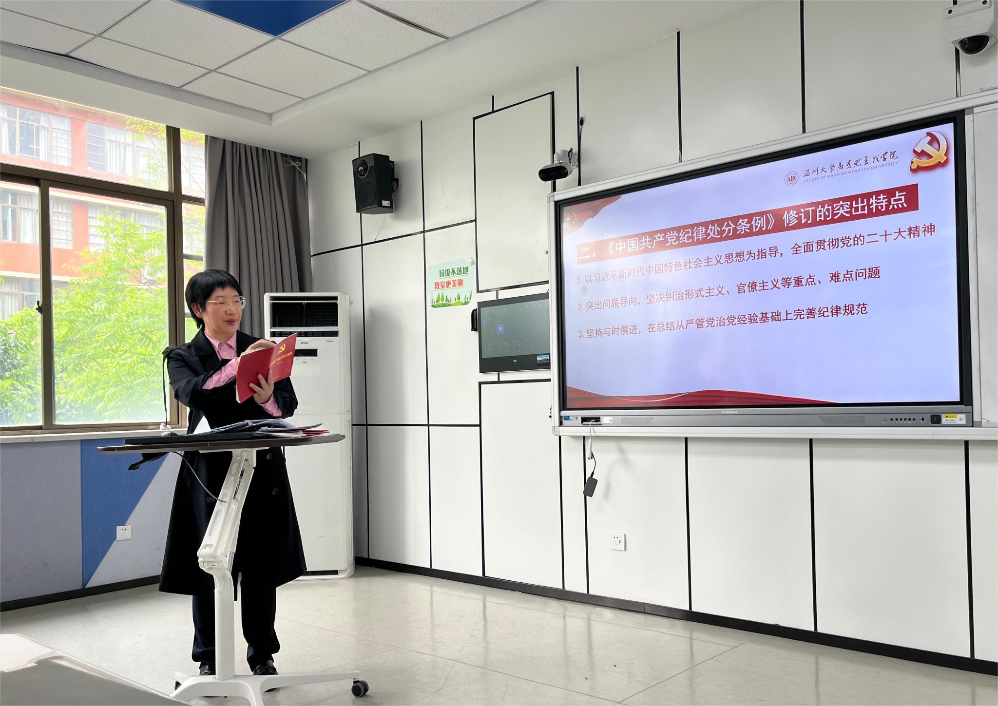 为深入学习贯彻《中国共产党纪律处分条例》(以下简称《条例》),根据学校党委工作要求,4月24日下午,杏吧视频 教工第一党支部全体党员在北校区4-204教室开展了“学条例 明党纪 做表率”主题党日活动,由支部书记项淳芳主持。
