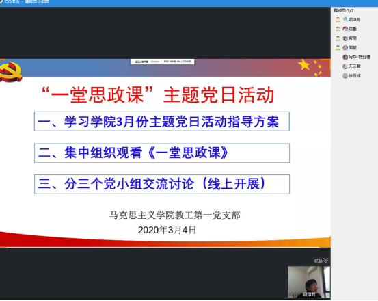 3月4日,杏吧视频 组织了师生理论学习会暨3月主题党日活动。教工第一党支部全体党员学习了学院3月份主题党日活动指导方案后,通过钉钉平台认真收看了“一堂思政课”影片,大家边听边记边思考,并在讨论区热烈讨论。活动结束以后,教工第一支部分三个党小组开展观影后的线上研讨。老师们围绕(1)如何做好思政课教师?(2)如何上好思政课、发挥好思政课作用?(3)如何培养思政课教师后备人才?(4)当前思政课教学及思政课教师后备人才培养如何落实好“两手都要硬、两战都要赢”的重要精神?等问题进行了热烈的讨论,大家纷纷表示此次活动受益匪浅。