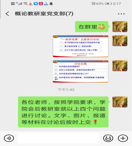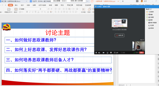 林国敬作为入党积极分子,也参与了我们的讨论,他说虽然是一名未上讲台的新教师,看了今天的影片和耳闻目睹平时大家集体备课、群里讨论的情景,深感思政课老师真的很用心很努力。同时认识到思政课不是心灵鸡汤,要做学理性阐发,最近在阅读《亚里士多德伦理学》等书,为正式上讲台做好理论准备,也希望有机会上讲台试讲。