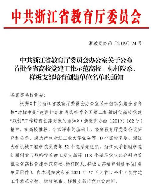 日前,在高校推荐、专家评审的基础上,经省教育厅党委会议研究和公示,遴选产生浙江工业大学党委等10个高校党委、浙江大学机械工程学院党委等52个院系党组织、浙江大学管理学院创新创业与战略学系教工党支部等108个基层党支部分别为首批全省高校党建示范高校、标杆院系、样板支部培育创建单位。杏吧视频 教工第一党支部入选首批全省高校“样板支部”培育创建单位。