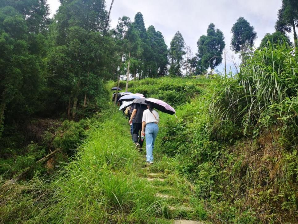 第一站来到了岩门百岭垟交通站。百岭垟交通站四面环山,满山竹林,十分隐蔽。师生一行从杂草丛生的百级石阶小路一直攀登到山林深处,在一处荒废的田埂上见证了革命历史的遗迹。随后,在交通员王五妹后人金爱道的追忆与叙述中,在场师生更加深刻认识到革命时期交通站建立的隐蔽需要和交通员执行任务的艰难险阻。