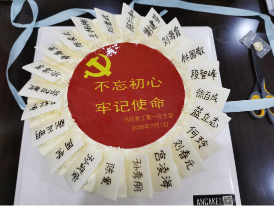 第二项、第三项议程分别是关于吸收林国敬同志为中共预备党员的发展大会和关于宫凌海同志的预备党员转正大会。在如此特殊的、充满纪念意义的一天入党和转正,两位年轻的博士党员倍感自豪和珍惜。第四项议程是举行集体政治生日大会。教工第一党支部以满满的仪式感隆重庆祝,并过上集体政治生日。据中央组织部最新党内统计数据显示,截至2019年底,中国共产党党员总数为9191.4万名,比上年净增132.0万名。党的基层组织468.1万个,比上年净增7.1万个,党的事业蒸蒸日上。全体党员倍感自豪之时,接力传党旗。同时组织观看了学习强国“七一”微视频《我宣誓》短片,回顾党的光辉历程,讴歌党的丰功伟绩,坚定共产主义信念。随后,有着30多年党龄的老党员孙武安等同志分别讲述自己的入党故事和峥嵘岁月中不变的初心,质朴的话语里饱含着对党的深情。大家纷纷表示要珍惜今天来之不易的幸福生活。最后,支部党员面向党旗,重温入党誓词,增强了党员使命感。支部为每位党员送上政治生日贺卡和纪念品,活动在支部党员分享集体政治生日蛋糕的温馨气氛中落下帷幕。