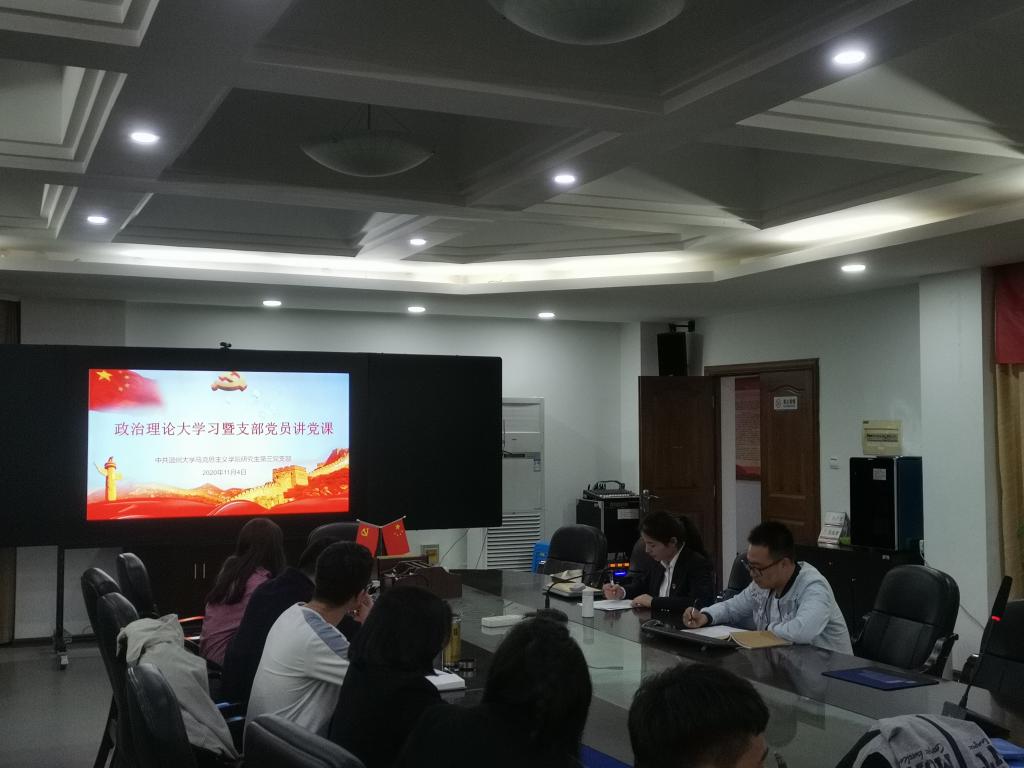 为了深入贯彻十九届五中全会精神,杏吧视频 研究生第三党支部11月4日晚在北校行政楼227会议室召开政治理论学习会暨党员讲党课活动。研究生第三党支部全体党员参加学习会,学习会由党支部副书记张凯主持。