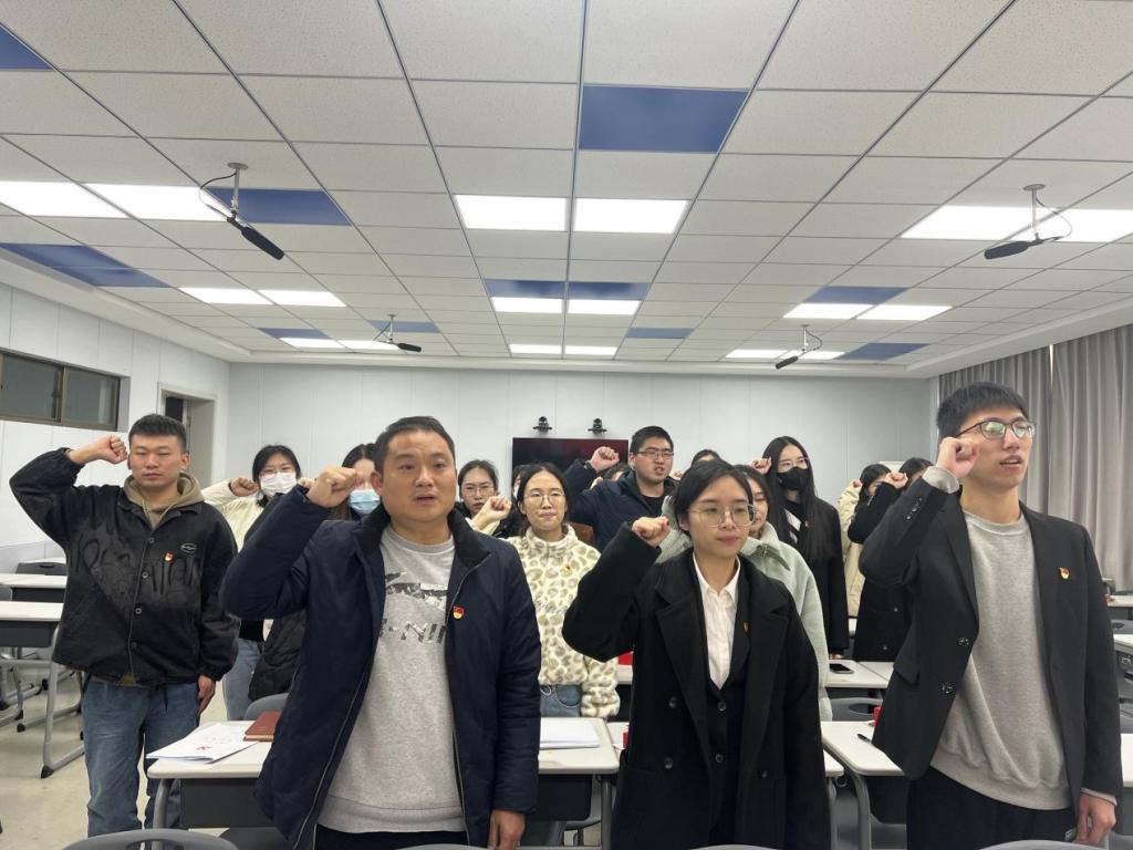 会议最后,在曹老师的带领下,集体党员高举右拳、面向党旗进行宣誓,在誓言中再次坚定要让青春在全面建设社会主义现代化国家的火热实践中绽放绚丽之花,立志做有理想、敢担当、能吃苦、肯奋斗的新时代好青年。