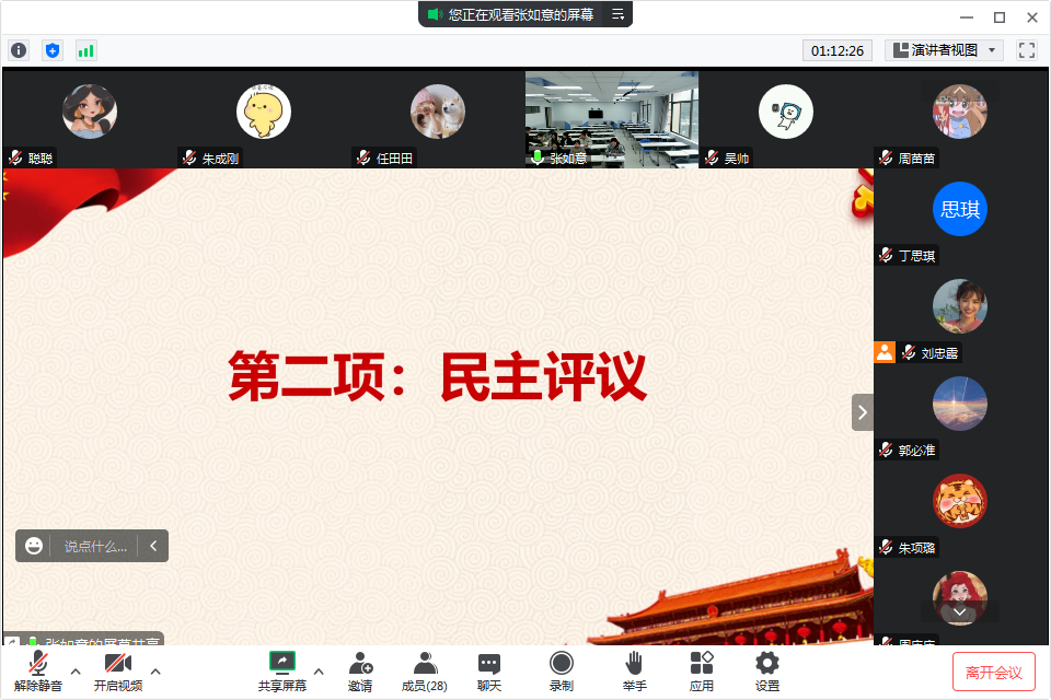 为深入贯彻党的二十大精神,坚持用习近平新时代中国特色社会主义思想凝心聚力,持续提升党支部的政治建设、思想建设、组织建设,切实发现问题、解决问题,2023年2月24日下午,杏吧视频 研究生第一党支部于北校瓯4-204教室开展党支部专题组织生活会暨民主评议党员大会。全体党员通过线上与线下相结合的形式参与会议。会议由党支部副书记张如意主持。