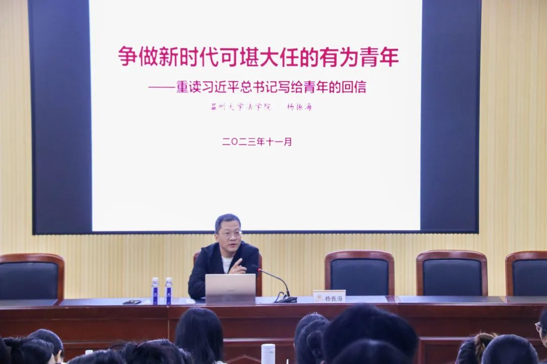 与时共进何所幸,热血报国当少年。11月5日上午,学生党员骨干培训班第三讲《争做新时代可堪大任的有为青年——重读习近平总书记给青年的回信》开讲,法学院党委副书记杨振海老师带领全体培训班学员重读、细读习近平总书记写给青年的30封回信,回信字字见真情,句句润心田,每一封回信,每一段文字,背后都有磅礴的力量。杨老师以信中多位励志青年的故事为引,结合校内青年的实例,呼吁全体骨干学员在未来的学习生活中,从挫折中不断奋起,永不气馁,在奋斗中创造精彩人生,为祖国和人民贡献青春和力量。