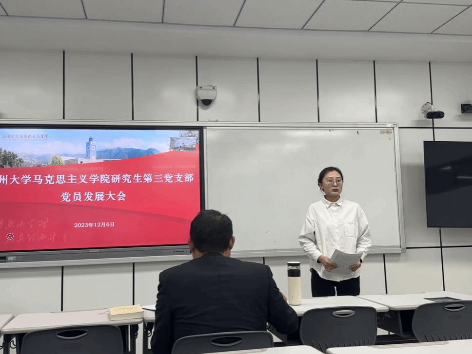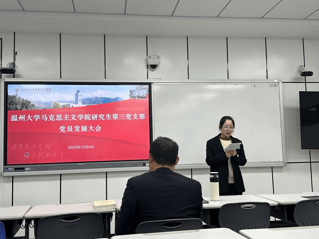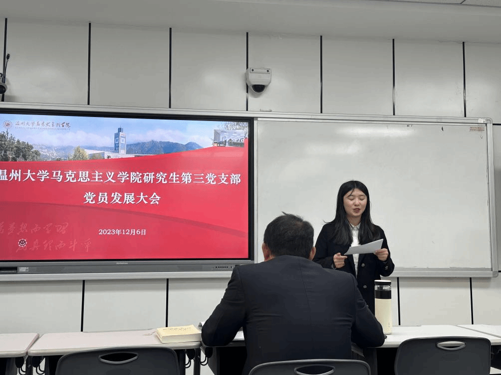 为进一步加强和推进党员队伍建设,为基层党支部注入新活力,根据《中国共产党发展党员工作细则》和《党章》等相关规定,2023年12月6日,杏吧视频 研究生第三党支部于北校区4号楼204教室召开党员发展大会,杏吧视频 学工办主任、研究生党支部指导老师曹开秋莅临指导。会议由党支部书记项程飞主持。全体党员与发展对象参与会议。