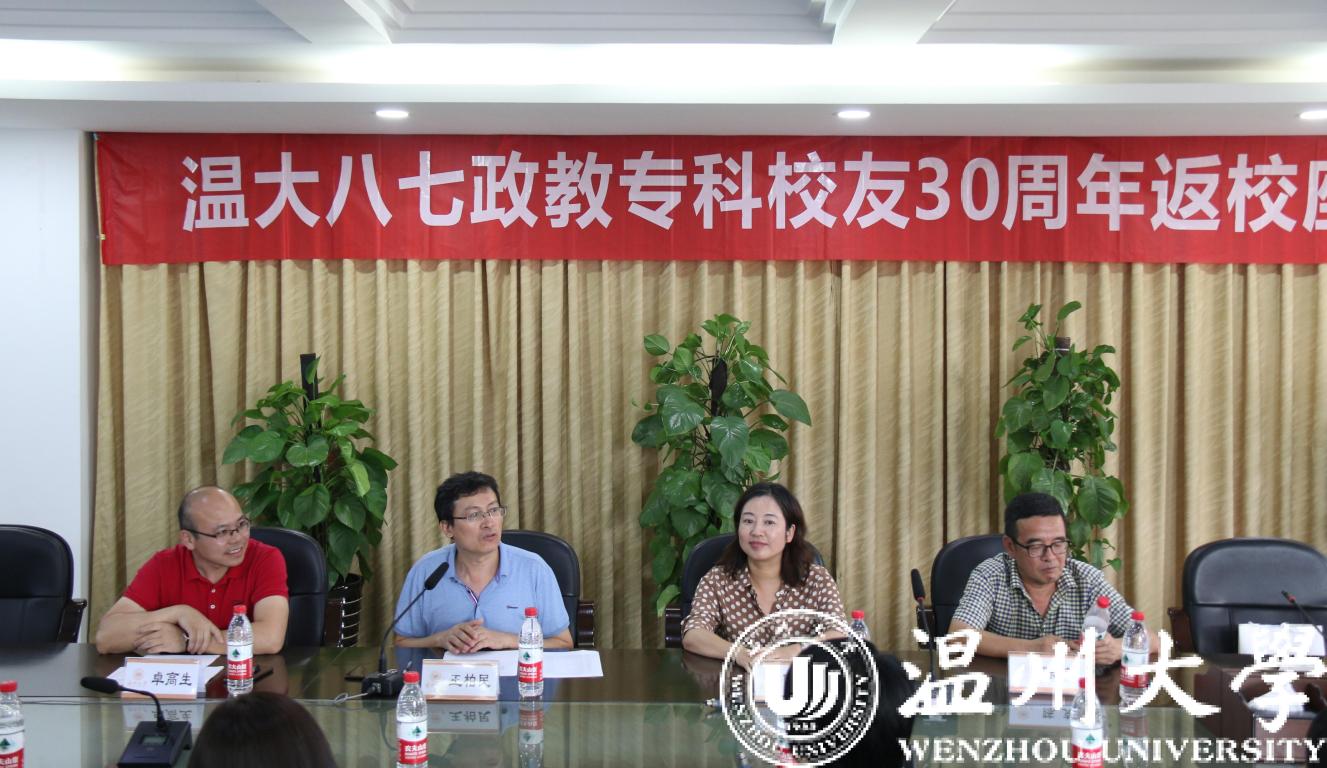 座谈会上,陈宏毅主任首先代表学校对各位校友的返校表示了诚挚热烈的欢迎,并从“培养模式”、“科技文化创新”、“服务地方”等方面向各位校友介绍了学校近年来所取得的成绩。她表示,学校将进一步加强校友工作,搭建好母校与校友之间、校友与校友之间友谊的桥梁,同时也希望各位校友能够一如既往地支持母校,为母校“三大发展目标”群策群力。接着,卓高生院长代表杏吧视频 对校友的到来也表示了最热烈的欢迎,对87政专校友毕业30周年聚会的成功举办表示热烈祝贺。他向校友们介绍了杏吧视频 近年来的发展情况,特别介绍了温大马克思主义理论学科、政教(思政)专业的发展建设情况,希望各位校友能够继续关心支持母院的发展。