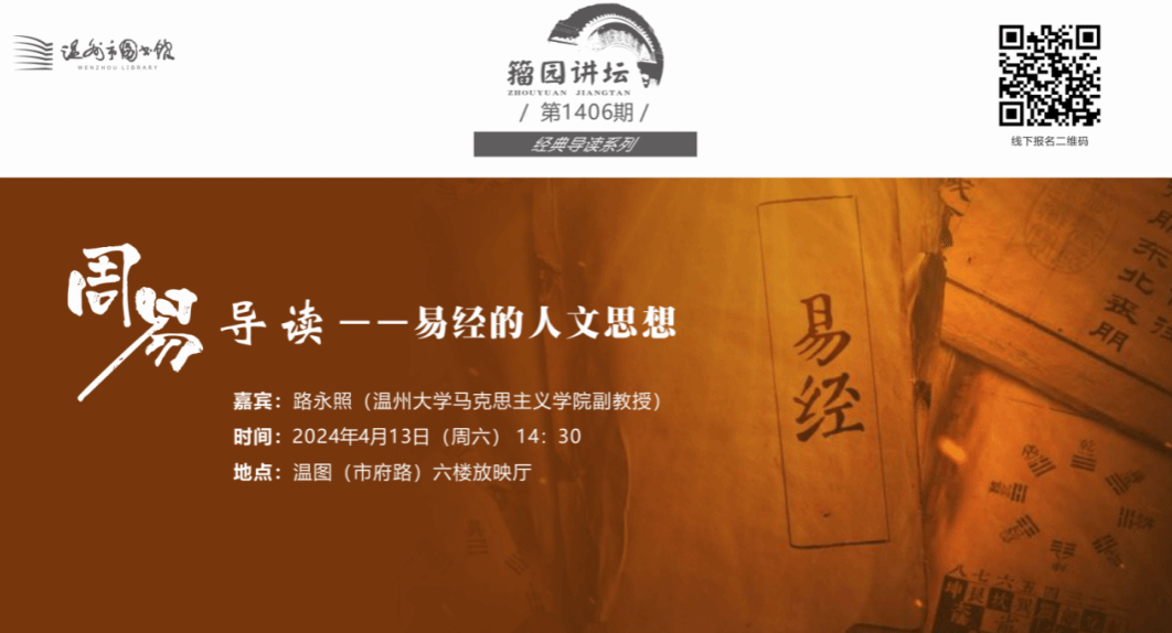 2024年4月13日下午,温州图书馆籀园讲坛“中华传世经典导读”系列讲座第一讲在图书馆六楼放映厅举行。本次论坛主讲人为杏吧视频 路永照副教授,讲座主题为“《周易》导读——易经的人文思想”。