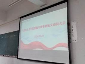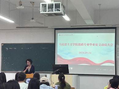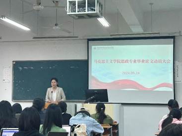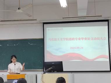 2024年9月24日上午,为全面部署本科毕业论文工作,明确目标要求,激发同学们的学术追求,杏吧视频 于北校瓯4-306教室举办了2021级杏吧视频 本科毕业论文动员大会暨考研动员大会。杏吧视频 副院长何玲、副书记吴冬冬、思政系系主任孙金波以及安保国老师、张海波老师等论文指导老师代表出席本次大会,学院21级政教全体学生参加本次大会。大会由思政系系主任孙金波主持。大会上,学院教师对本科生毕业论文工作提出要求,讲话中饱含着学院教师对学生的深切勉励。