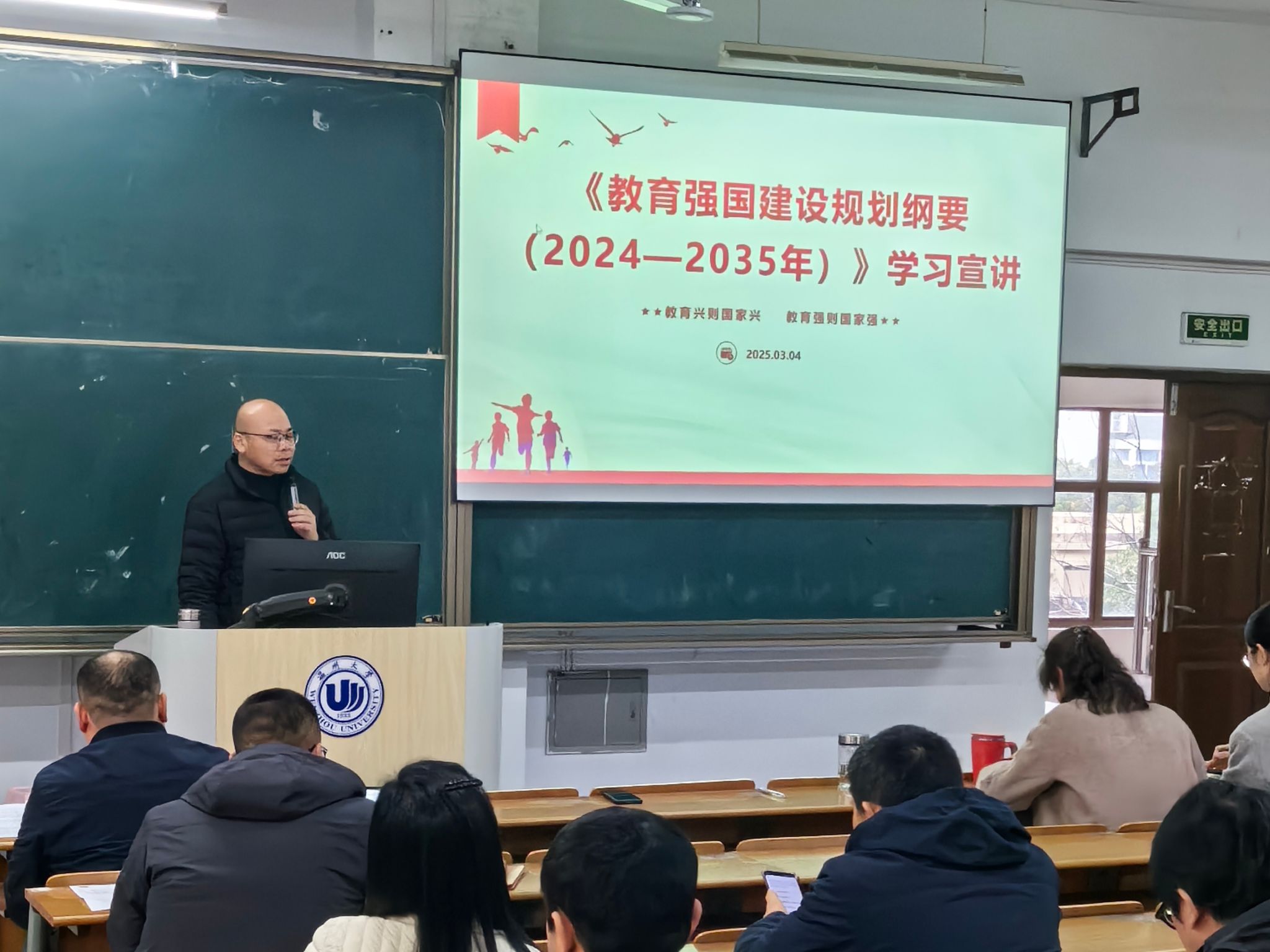 卓高生院长进行《教育强国建设规划纲要(2024—2035年)》学习宣讲。《纲要》是新时代教育事业发展纲领性文件,紧紧围绕教育的“三大属性”,以“六大特质”为主要特征、以“八大体系”为基本结构、以正确处理“五个重大关系”为关键要求,将深化改革贯穿全文,突出教育科技人才一体统筹部署,推出一系列创新举措,推动从教育大国向教育强国的系统跃升。他强调,一是要提高政治站位,深刻领会教育强国建设的重要意义,准确把握核心要义与总体目标。二是要聚焦重点任务,明确学院发展方向与重点任务,密切追踪人工智能发展的新动态,运用新技术提升教学质量,积极探索教育改革路径。三是要明确发展定位,聚焦学科建设与专业发展的关系,进一步明确学校发展定位与学科专业特色,切实增强贯彻落实的责任感、使命感和行动力,主动扛起推动学院高质量发展的担当使命。