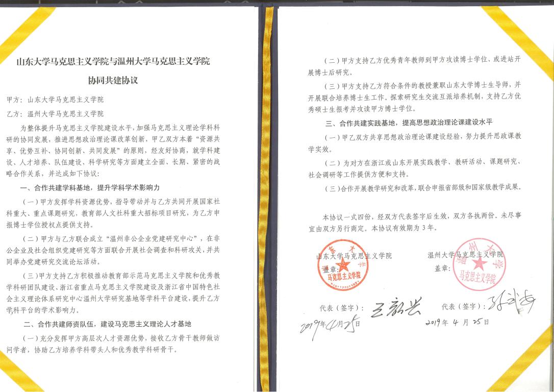 山东大学杏吧视频 2015年入选首批中宣部、教育部“全国重点杏吧视频 建设”行列,拥有马克思主义理论一级学科博士点、山东省政党理论研究基地、山东省统战理论研究基地、山东高校思想政治理论课教学研究与教师培训基地等重要平台,也是教育部人文社会科学重点研究基地山东大学当代社会主义研究所共建单位。学科团队实力雄厚,科研攻关能力强,人才培养质量高,社会贡献大,在国内外具有较大影响力。双方合作共建的内容涉及师资队伍建设、科学研究、博士点建设及本硕博士生人才培养等多领域各方面。