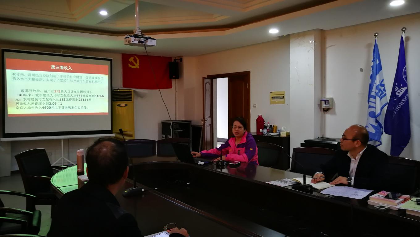 概论教研室在北校行政楼125会议室举行了集体备课会,在会上,与会者就习近平总书记3.18讲话精神进行了深入学习。谢建芬老师进行了围绕温州两个健康先行区,作了专题讲座。她分析了温州民营经济发展的历史成就,发展的现状,温州为什么要实施“两个健康”先行区发展战略。目前,温州推进“两个健康”先行区采取什么样的策略。卓高生副院长对专题进行高度的评价,同时他指出,要将温州“两个健康”先行区发展思想融入概论课的专题教学中。备课会上老师们还就组织现场教学、教学中遇到的问题,以及组织教学视频录制等工作进行了讨论。