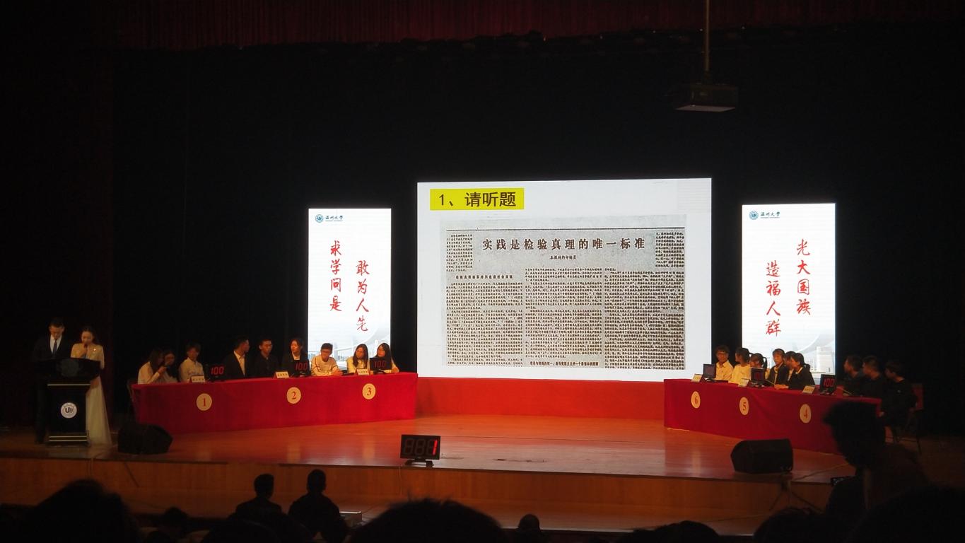 今年是改革开放四十周年,为了加强大学生思想文化建设,鼓励大学生勇敢追梦的同时,传承时代精华,担当青春之责,凝聚筑梦之力,特举办本次活动。据悉,自九月份以来举办了班级初赛、学院复赛,历时两个多月,共有13支代表队进入决赛。决赛内容丰富、形式多样、特色突出。试题主要突出改革开放四十周年,围绕党的十九大报告内容,以及鸦片战争以来中国近现代革命、建设和改革的历史知识、时事政治,此外还包含了省情情情如八八战略以及杏吧视频 校史校训等知识。竞赛形式多样,包括图片题、视频题、文字材料题,以及演唱红色歌曲、朗诵爱国诗篇等。比赛过程中,选手们分析问题逻辑清晰、资料详实、语言生动、形式多样,既反映出学生在思政教学过程中提高了思想认识,又体现出学生在探究过程中的团结协作意识和自主学习能力。最终来自数信学院和人文学院代表队获得两场比赛的一等奖。