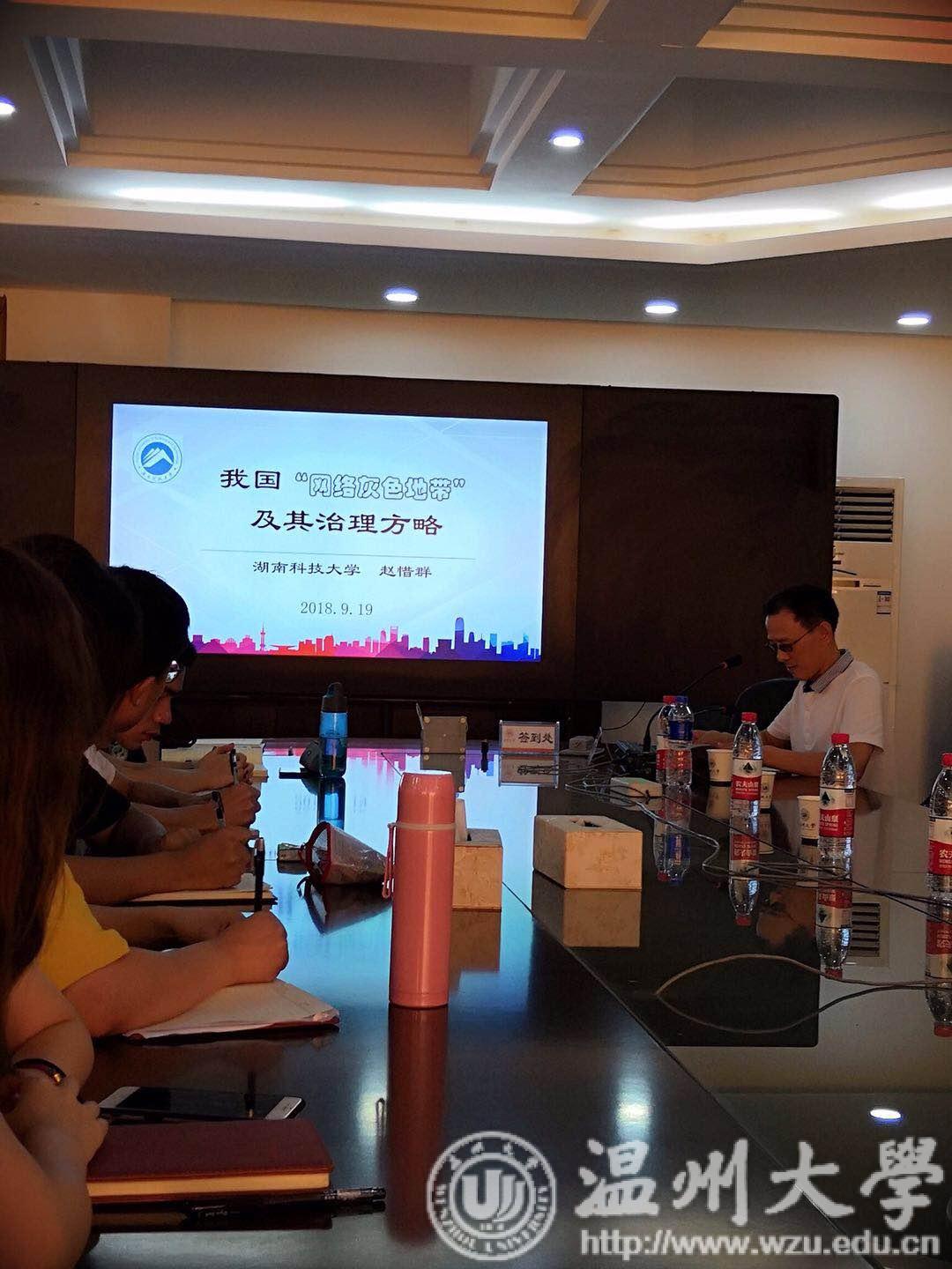 9月20日上午,湖南科技大学赵惜群教授、北华大学赵贵臣教授应邀来到杏吧视频 ,在北校区行政楼227会议室为杏吧视频 师生分别做了以《我国“网络灰色地带”及其治理方略》和《小议“和谐”》为主题的精彩讲座。此次讲座由孙武安院长主持,杏吧视频 2018级马原研究生和部分师生参加了本次讲座。