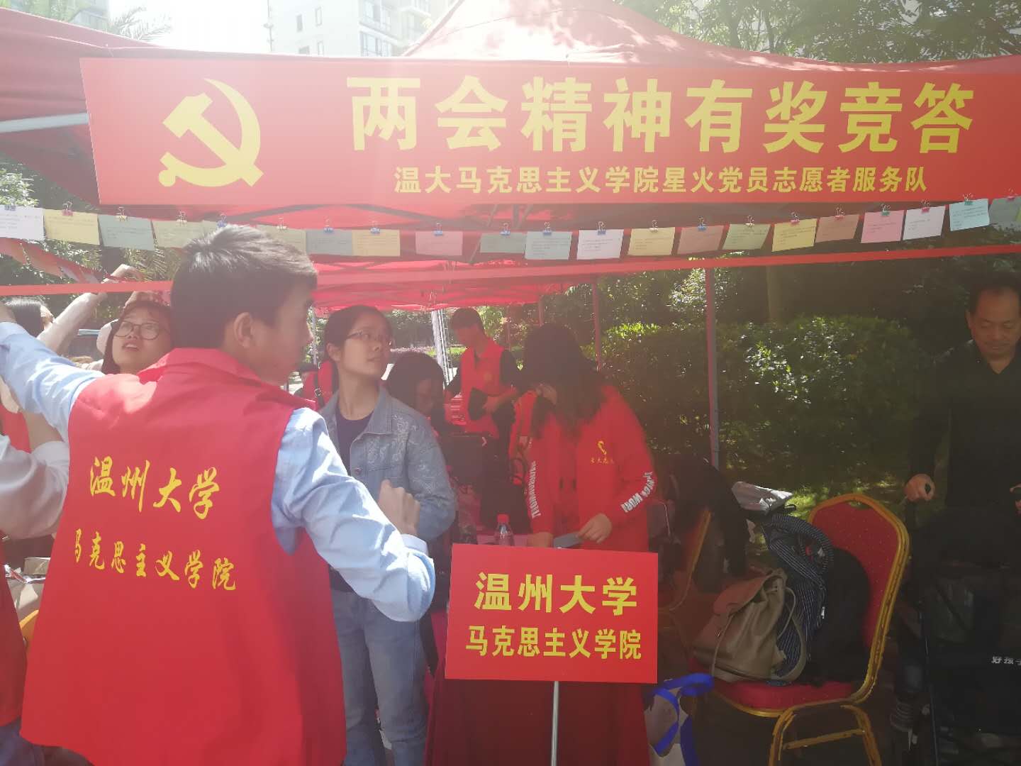 项目启动仪式主由博园社区党支部书记与各志愿团体签约并授牌、与会领导向签约单位授志愿者队旗以及签约代表上台认领服务项目等议程,马院研究生党支部书记徐晶晶同志代表杏吧视频 星火服务队接受了该活动授予的志愿者队旗,并挥动队旗展示星火服务队风貌,党支部委员洪丽丽、孟江龙同志代表星火服务队上台认领服务项目。此项目启动仪式结束,各志愿者单位在博园社区文化广场有序地开展志愿服务,服务项目多样,比如“免费配钥匙”、“免费贴膜”等,作为马院的一份子,星火服务队紧跟时代潮流,为更好向博园社区居民传播两会精神,组织了“两会知识有奖竞猜”的活动。