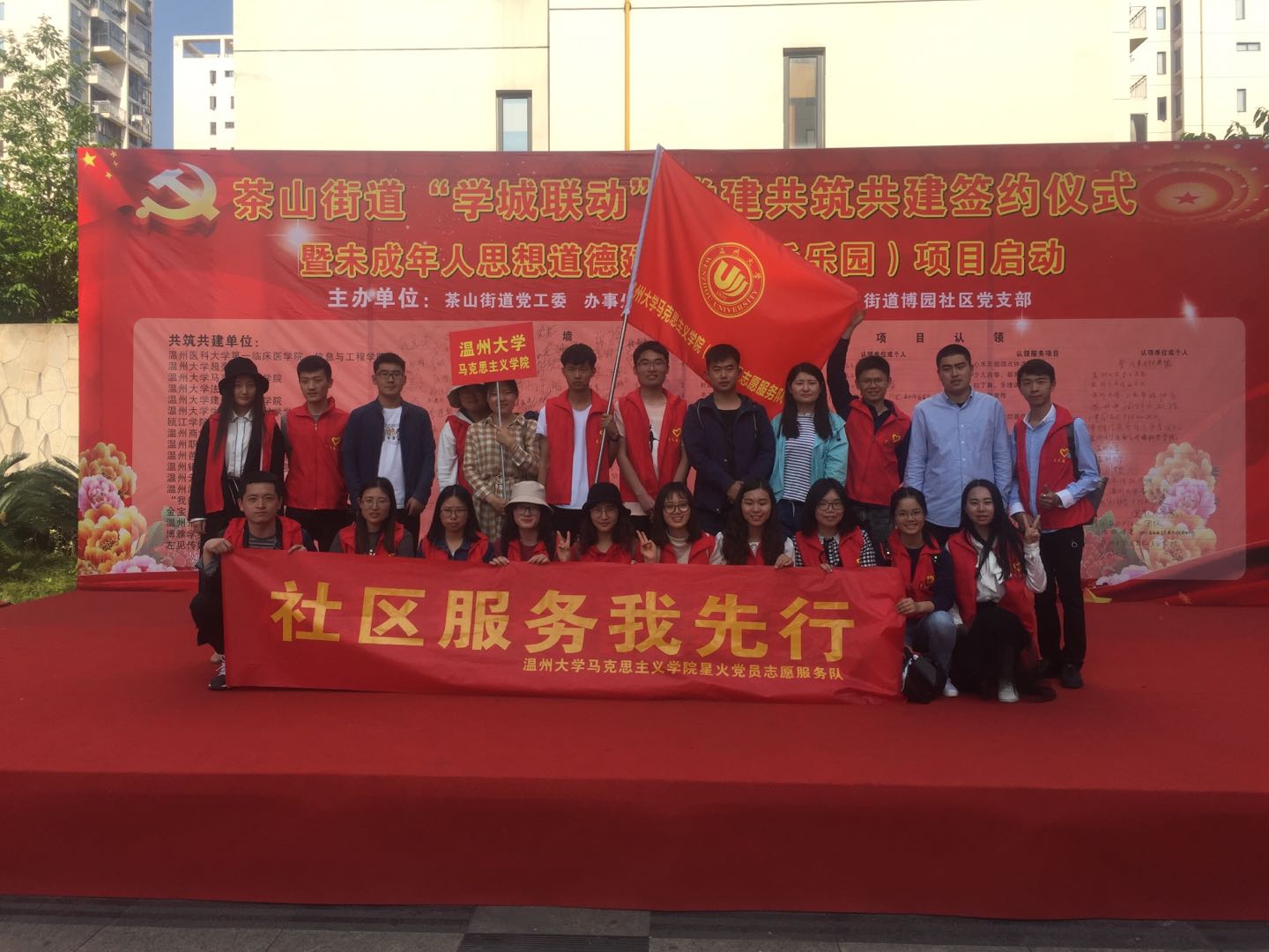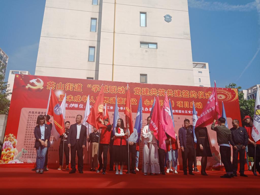 4月18日下午,瓯海区茶山街道党工委、办事处在博园社区文化广场举行茶山街道“学城联动”党建共建共筑签约仪式暨未成年人思想道德建设“心禾乐园”项目启动仪式,出席活动的有瓯海区委组织部、博园社区及杏吧视频 超豪学区等单位领导,马院研究生星火服务队作为志愿项目认领团队参与了此次仪式。