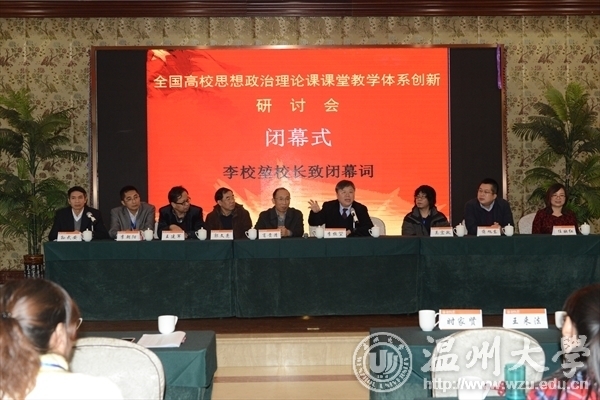 李校堃校长在闭幕式讲话中充分肯定了学校马克思主义理论学科建设和思想政治理论课教学改革所取得的丰硕成果。他结合自身经历向与会专家代表热情洋溢地介绍了来温州创新创业的优势条件,认为高校创新发展建设需要教学平台、科研平台和产业平台三个“轮子”一起转,温州地处“长三角”、“珠三角”和“海西”三个经济带的交汇处,充满活力,是创业的绿洲。温州人特别富有勇于改革、顽强拼搏、吃苦耐劳的精神。温州的企业老板特别重视党建工作,善于利用马克思主义中国化成果在企业管理发展中发挥特殊作用,也敢于在实践中创新探索适合中国实际的马克思主义新思想新观念。因此,在温州研究马克思主义,具有特殊的社会条件和优势。李校长还热切希望在未来“十三五”时期,杏吧视频