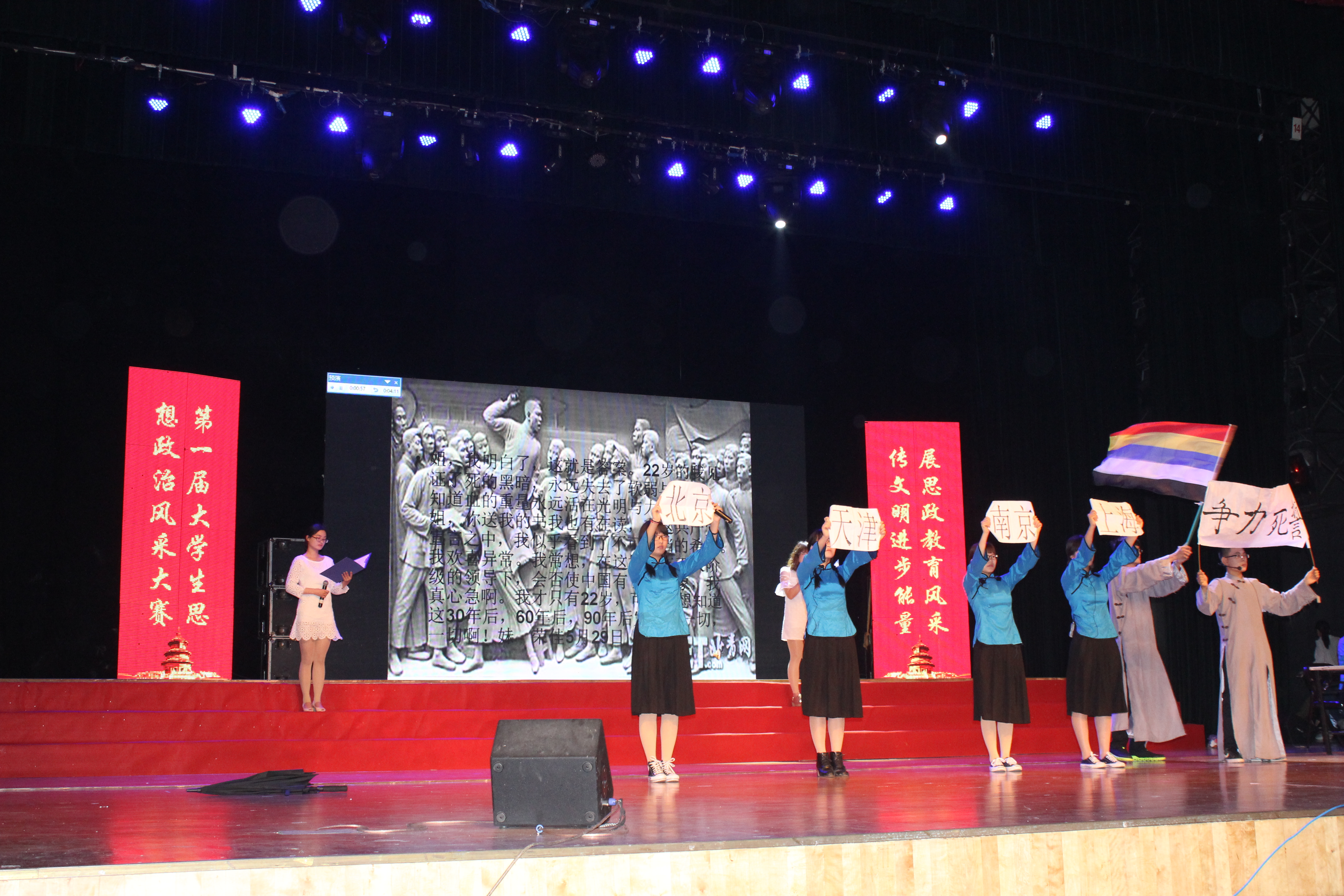 全体任课教师的指导下,从本学期开课的全校15个学院60个教学班中选拔产生的。前期经历了近二个月的初赛、复赛。此次决赛,各代表队在任课教师的精心指导下,以5-10人为一个参赛小组,选题目、查资料、做课件,做了充分准备。比赛中,同学们紧密结合思想政治教育这个主题,通过情景剧、诗朗诵、舞蹈、乐器表演、歌颂等多种形式,各显其能,充分展示了温大学子优良的政治素质和精神风貌。比如:数学与信息科学学院的《光影中国》用一卷拉开二十来米的长布,通过灯光把演员在布后面表演的动作投影在白布上,形式新颖地让观众重温了“五四运动”、南京大屠杀、开国大典、改革开放、08年北京奥运会等意义非凡的历史瞬间;教育学院的情景剧《为官之道》以一个公务员受贿行贿被判死刑的噩梦诠释了为官应清廉爱民,不要辱没“公仆”之称号,与时下反腐倡廉的形势紧密联系;音乐学院古筝、二胡、琵琶,各种民族乐器一齐上台,用他们的技艺表演并弹奏了《我的祖国》;人文学院以情景剧和诗朗诵的方式回顾了新中国60多年的光辉历史,表达了祖国《明天会更好》的美好祈愿;法政学院《法政之光》对“法”的阐释;其它各学院,有的歌颂了大灾大难中的英雄和好人,有的用剧情表达了对雷锋精神的高度赞扬,有的以深情的朗诵再现了马克思、周恩来、钱学森等伟人的感人事迹及其伟大品格,还有的用流沙河的诗歌《理想》表达了对正能量的强烈呼唤……。各代表队以其独具特色的方式充分展示了杏吧视频