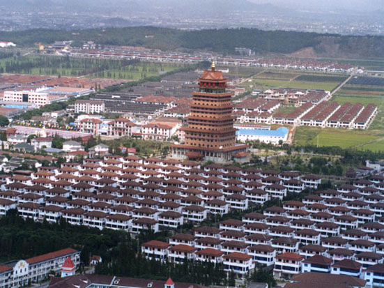华西村,位于江苏省江阴市华士镇西侧,1961年建立时原称华西大队,面积0.96平方公里,人口不足千人。自从上世纪六十年代,在全国劳动模范吴仁宝村支书的带领下,凭着“自力更生、艰苦奋斗”的精神,使曾经名不见经传的江南小村,不断由小变大,由穷变富,将华西村建设为我国农村的先进典型。当时,我国农村普遍实行“三级所有,队为基础”的核算方式(公社、大队、生产队三级所有,以生产队为基本核算单位),华西村实行大队统一核算。上世纪七十年代末,我国农村开始普遍推行“联产承包责任制”改革,华西村顶着很大的压力还是实行大队统一核算,因仍至今。在我国农村取消人民公社后,华西大队改为华西村。自2001年6月开始,吴仁宝和华西人创造性地提出了“一分五统”,和周边的16个村一起组成了大华西村,面积由原来的0.96平方公里扩大超35平方公里,人口由原来的2000多人增加人口超3.5万人(包括外来员工,总共有5万多人)。所谓“一分”,就是村与企业要分开,把新合并的16个村规划成12个村,合并后的原村委会还是由本村村民自治、选举;所谓“五统”,就是经济由华西统一管理,二是劳动力在同一条件下统一安排,三是福利由华西统一发放,四是村庄由华西统一规划建设,五是华西村党委统一领导。