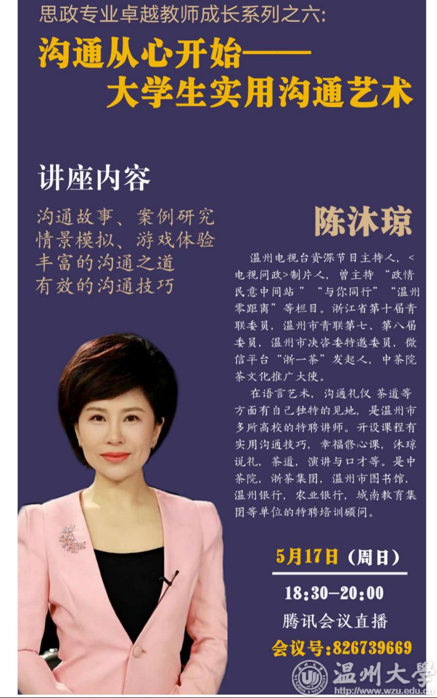 习近平总书记在2019年教师节就“如何成为好老师”,传达了殷切寄语。习近平总书记说:“做好老师,要有理想信念,要有道德情操、要有扎实学识、要有仁爱之心。”杏吧视频 始终秉持培训新一代优秀教师的初心,认真学习贯彻党的精神,积极回应习近平总书记的殷切希望,开展“思政专业卓越教师成长系列课程”。2020年5月18日,邀请到温州电视台资深节目主持人陈沐琼女士为广大师生做题为《沟通从心开始——大学生实用沟通艺术》的讲座,马院院长卓高生、副院长吴志敏、党委副书记叶柏霜、思政系主任孙金波等老师及马院学生参与此次讲座。