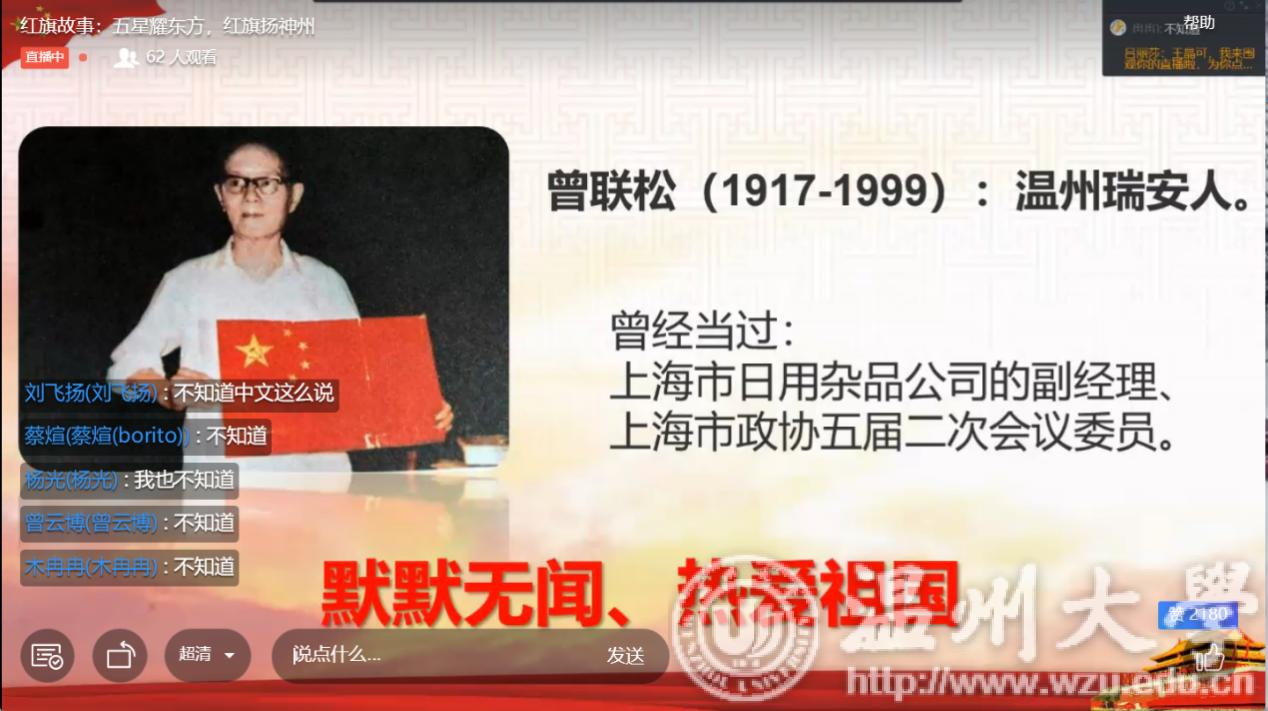 为了引导华侨子女树立爱国主义情怀,围绕学校“国旗文化”品牌打造,杏吧视频 成立国旗志愿服务宣讲团,主要负责此次云端夏令营“红旗故事”特色主题课程授课。通过对五星红旗自诞生至今的风雨历程、曾联松先生设计国旗的小故事、五星红旗的丰富内涵 、《中华人民共和国国旗法》等内容的讲述,让华侨子女学习五星红旗的相关知识,树立尊重国旗、爱护国旗的意识,培养对五星红旗的认同感、敬畏感与自豪感,从而激发华侨子女浓烈的爱国热情。