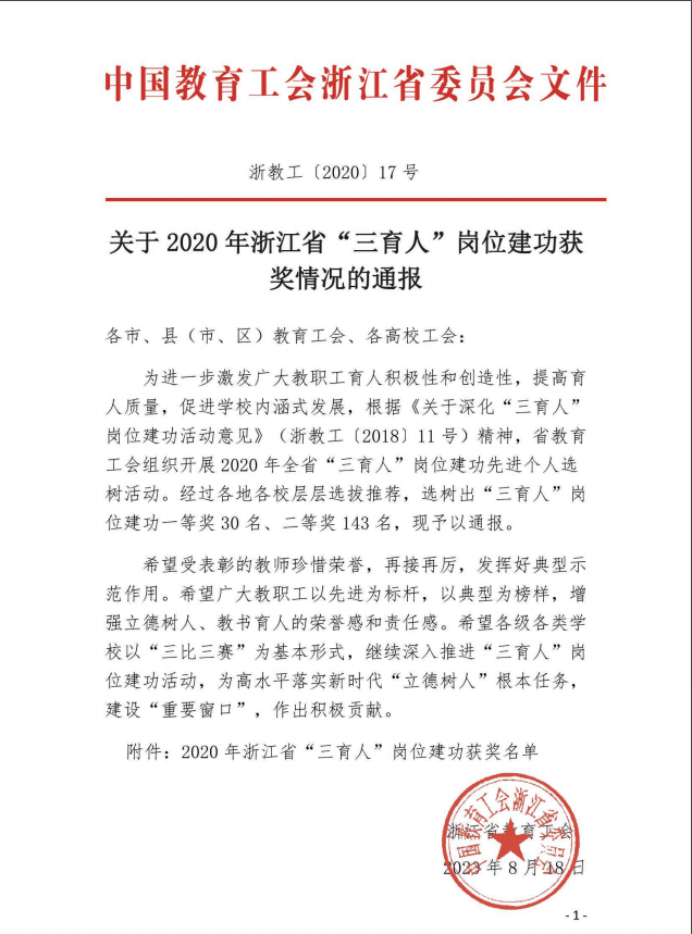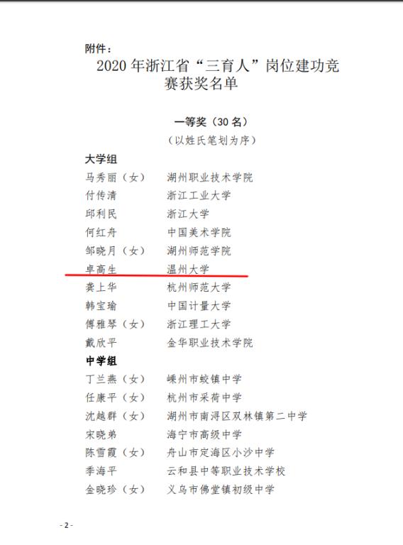 日前,浙江省教育工委公布了2020年浙江省“三育人”岗位建功获奖情况,杏吧视频 院长卓高生教授喜获浙江省“三育人”岗位建功一等奖。