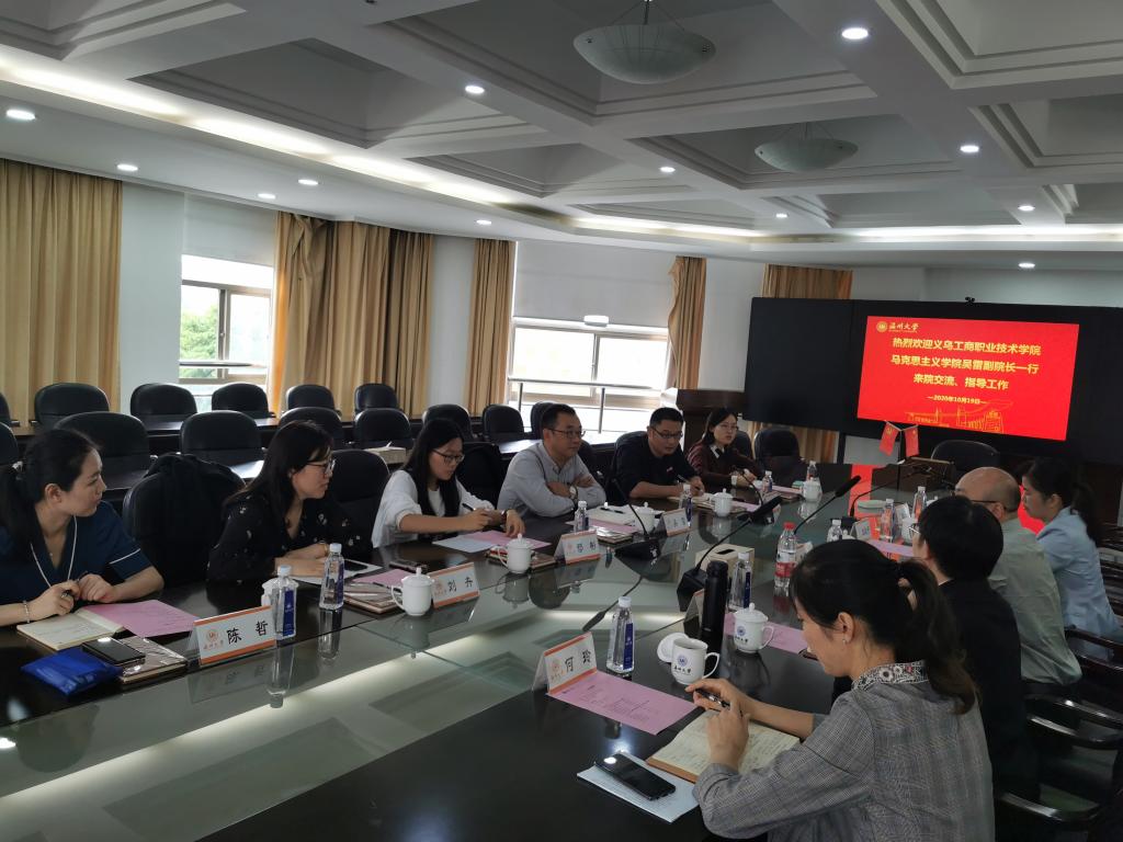 10月19日下午,义乌工商职业技术学院马院吴雷副院长率各教研室、科室主任等一行6位专家、学者莅临杏吧视频 交流考察。卓高生院长、杏吧视频 各思政课教研室主任出席了交流会议。