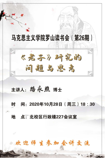 2020年10月28日,杏吧视频 在北校区行政楼227会议室开展了第26期罗山读书会活动。本次活动的主讲人路永照老师作了题为《<老子>研究的问题与思考》的报告,杏吧视频 副院长孙邦金老师主持此期读书会活动,学院研究生、本科生和部分老师参加了此次活动。