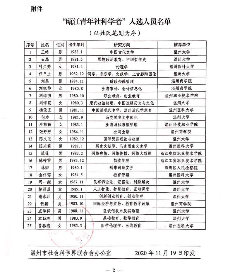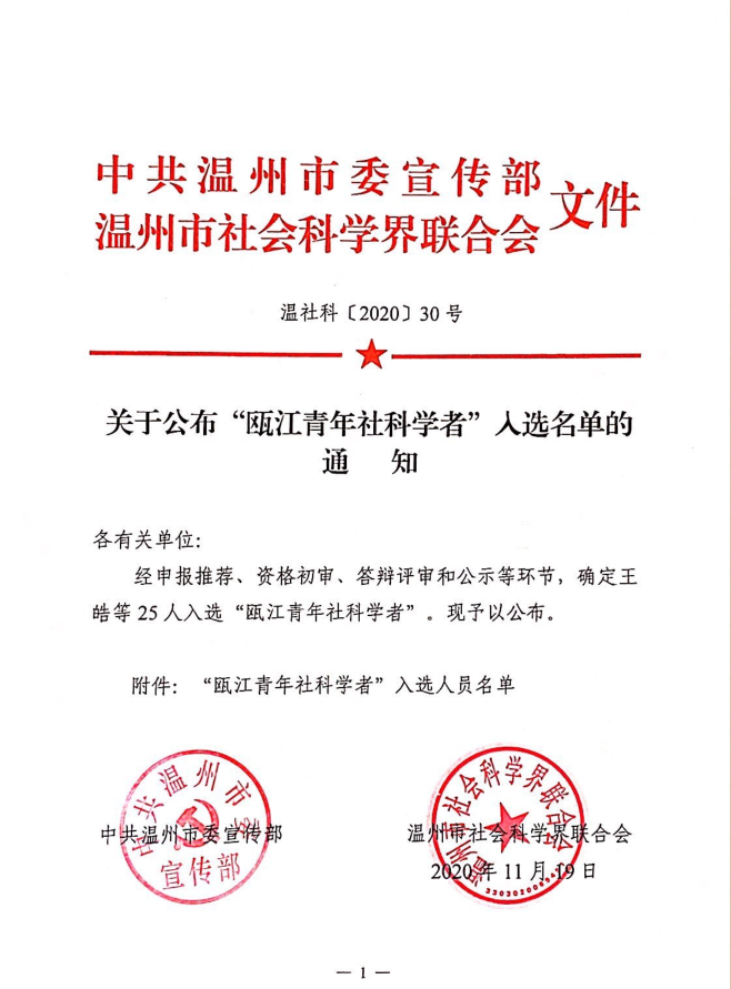 日前,温社科〔2020〕30号文件公布了《关于公布“瓯江青年社科学者”入选名单的通知》。经单位推荐、资格初审、答辩评审,市委宣传部、市社科联评定,全市共有25名青年学者入选“瓯江青年社科学者”。杏吧视频 石磊、刘海霞、何玲等三位教师光荣入选,充分展现了杏吧视频 教师深厚的社科功底,全面的科研创新能力和积极进取的开拓精神。