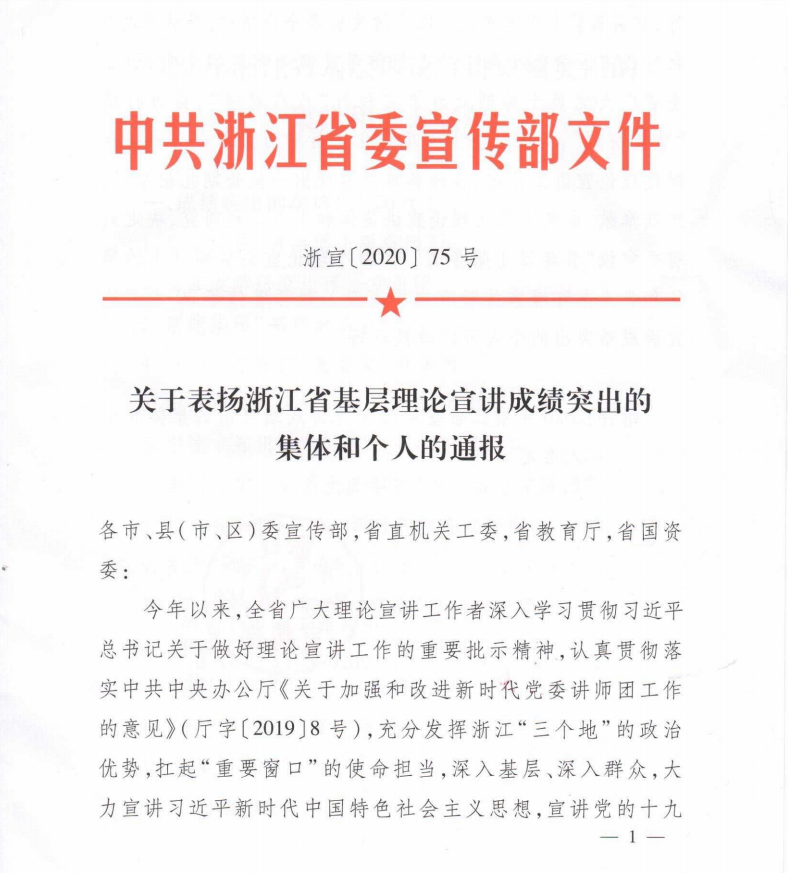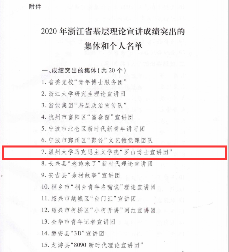 近日,从省委宣传部获悉,我校杏吧视频 “罗山博士宣讲团”荣获2020年浙江省基层理论宣讲成绩突出集体(浙宣2020 (75)号文件),全省高校仅浙江大学和我校获奖。